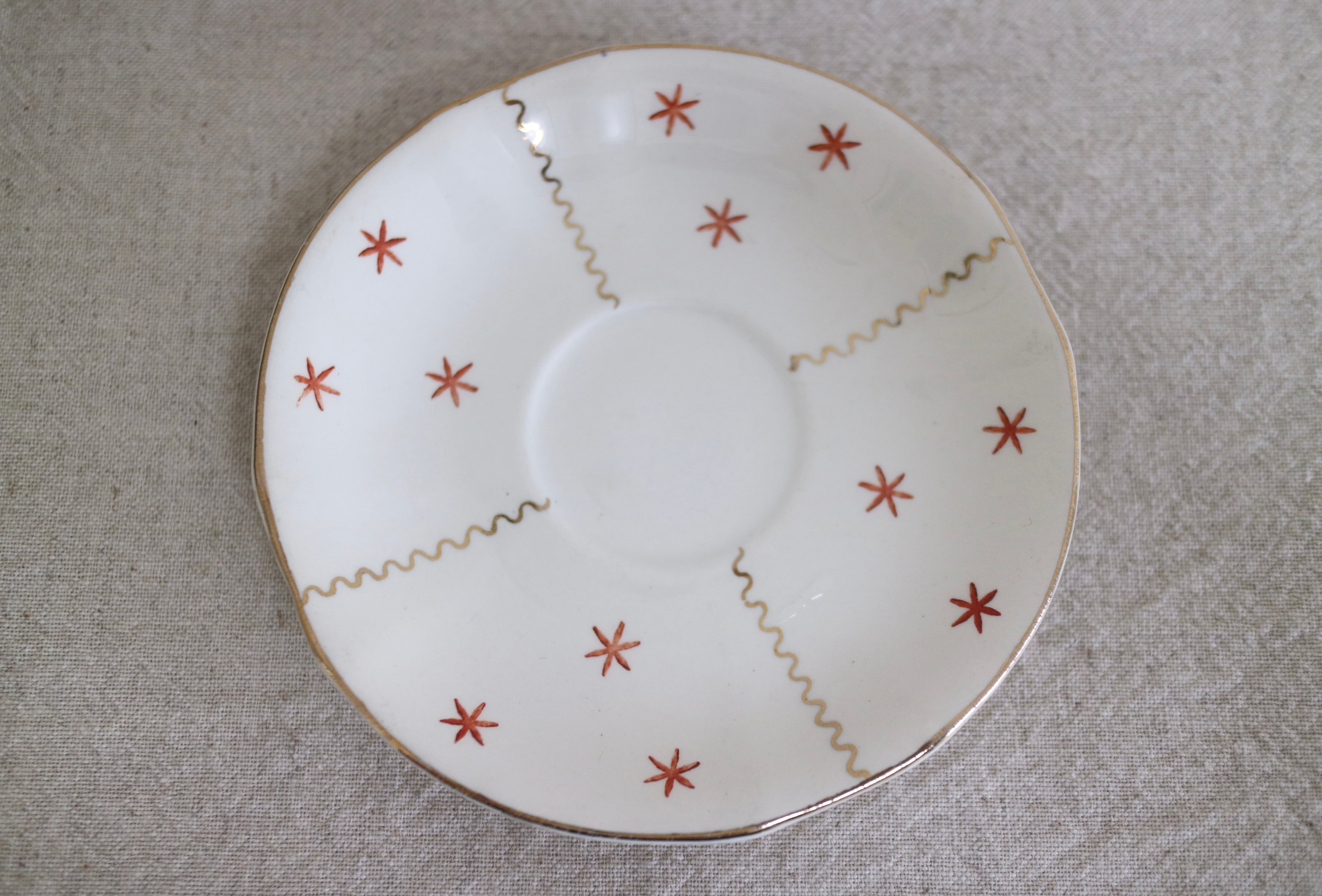 オレンジで雪の結晶をモチーフにしたようなデザインと、うねうねの金彩ラインがレトロでとても可愛いカップ&ソーサーです。