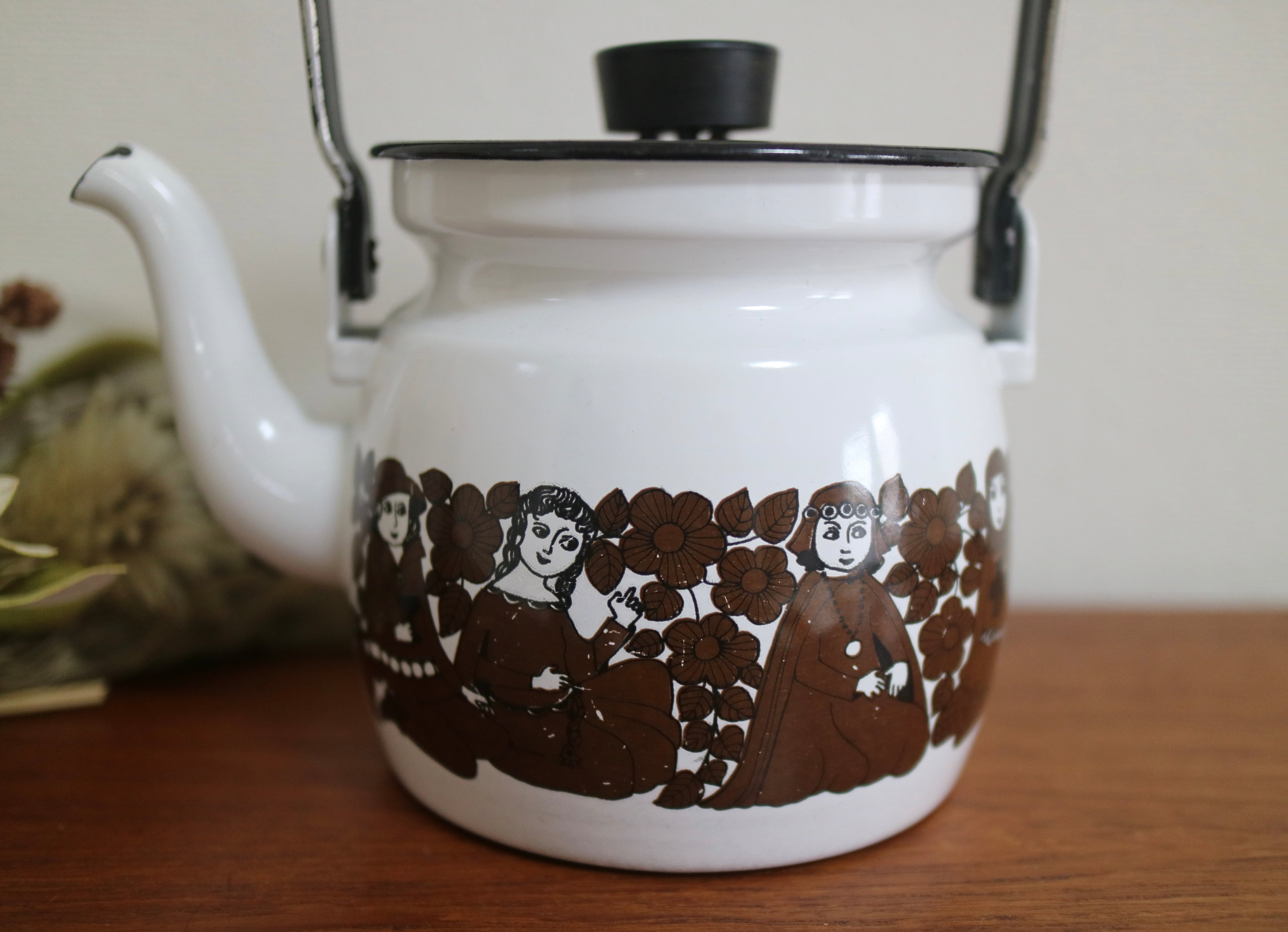 1960年代~1970年代にかけて製作されていた、ARABIA社のホーロー部門「Finel(フィネル)のケトルが入荷しました。兵士・音楽家・婦人たちやお花がデコレートされたレトロな雰囲気のケトルです。