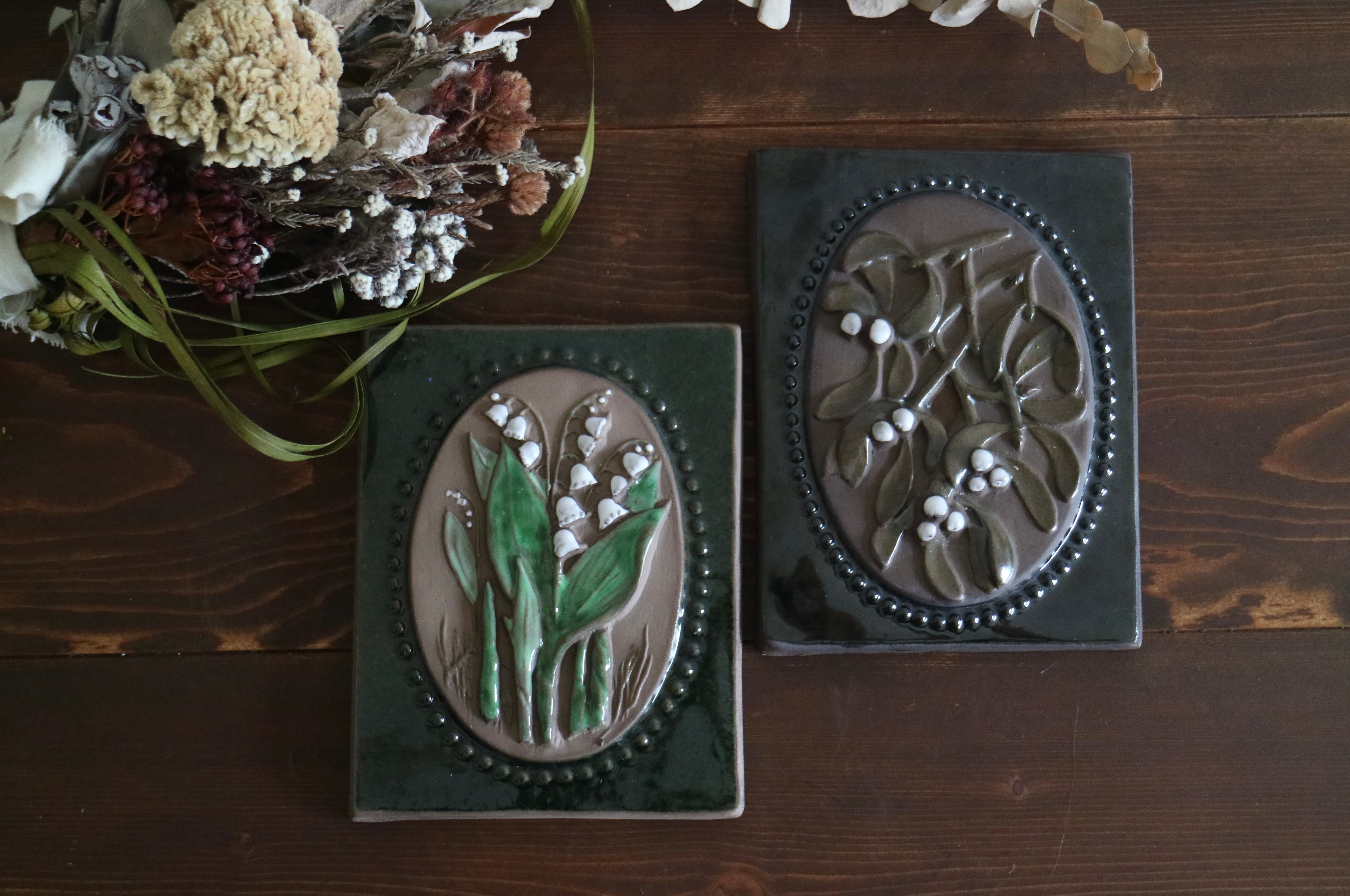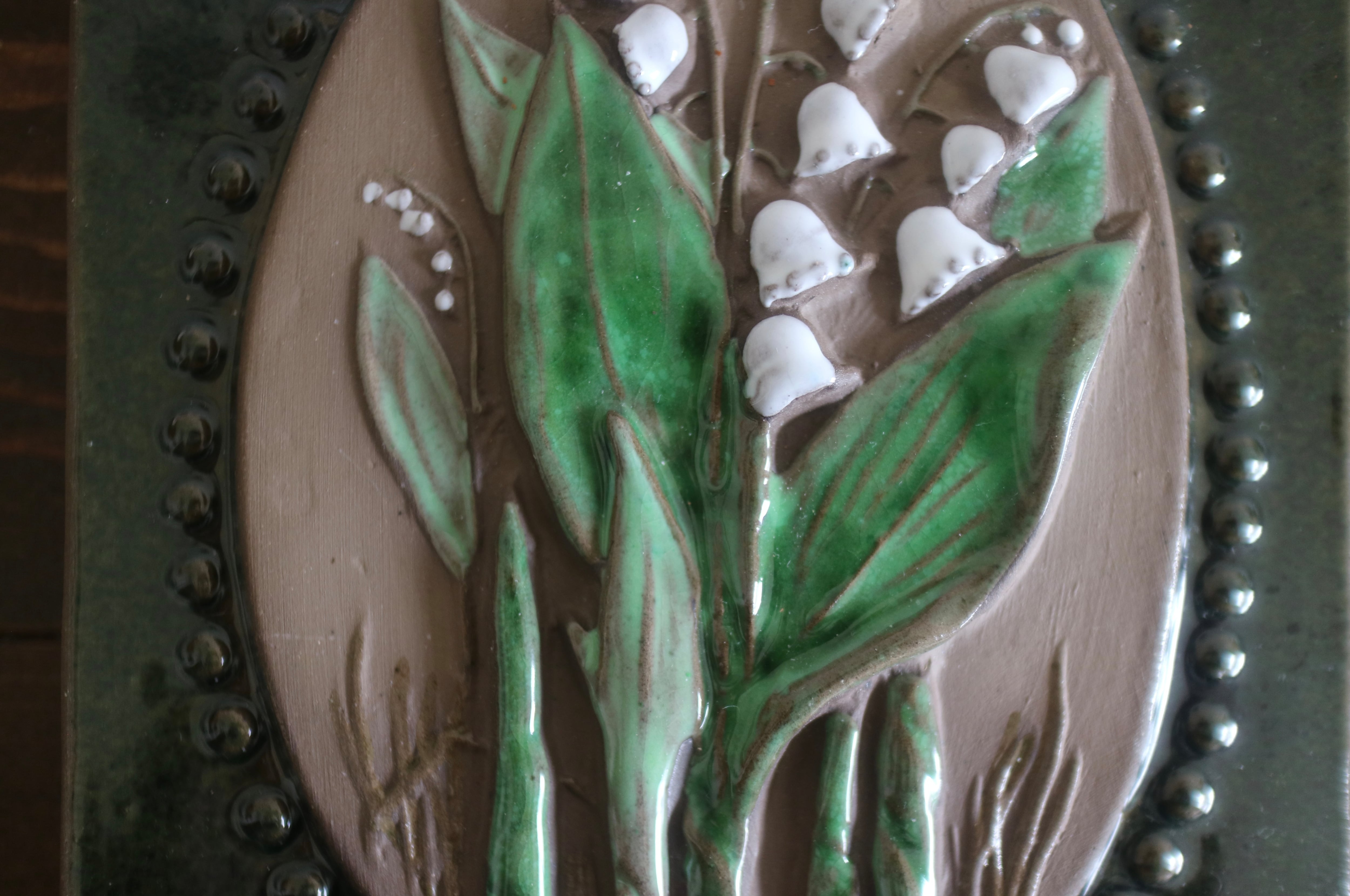 スウェーデン Jie gantofta社、スズランの陶板です。こちらは壁掛けタイプの陶板でシックで素朴な色合いの雰囲気の中にホワイトカラーで可愛らしいスズランが少し立体的に描かれています。