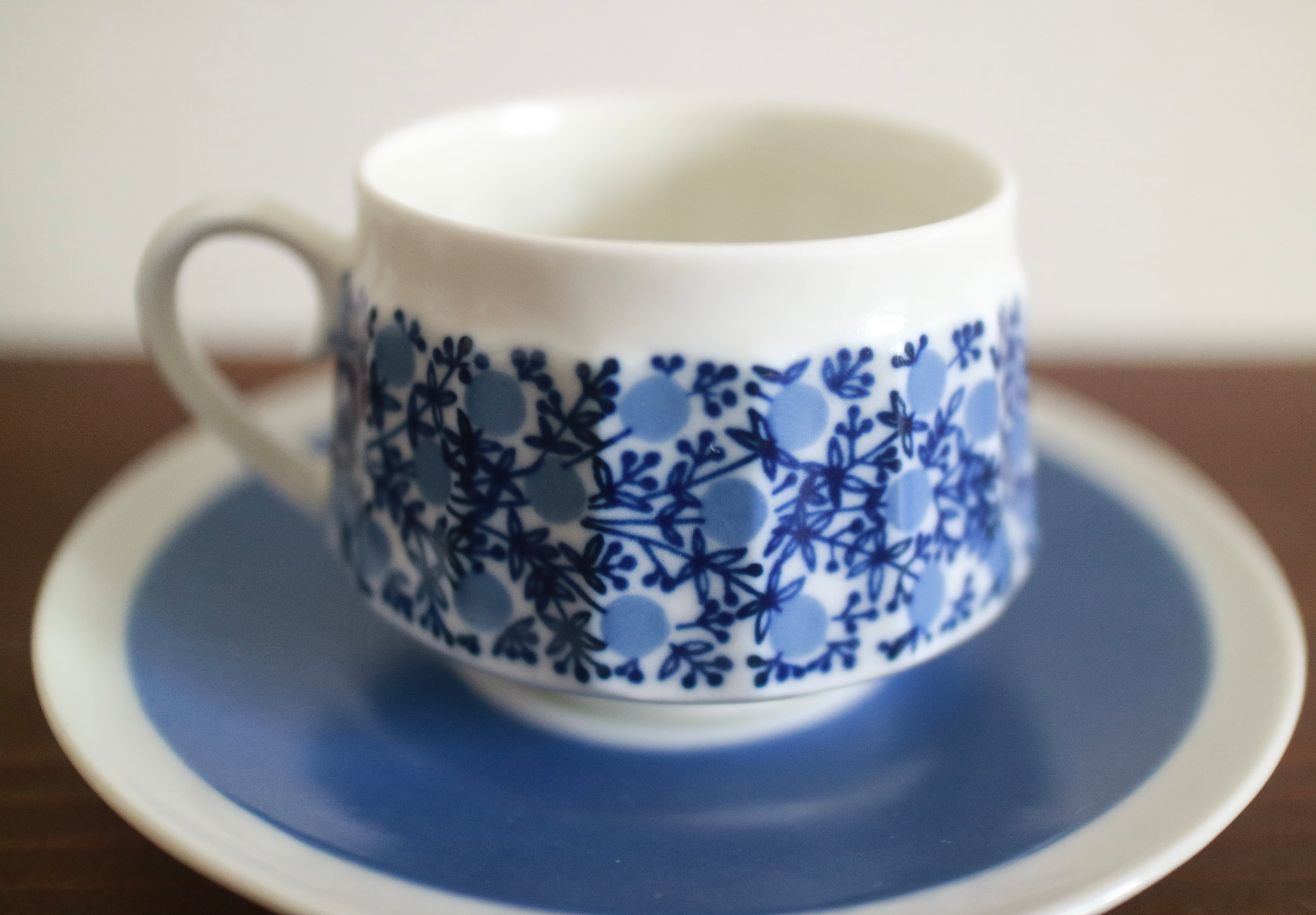 ARABIA社、Doriaシリーズのコーヒーカップ&ソーサーです。デコレートデザインは、Ruija(ルイヤ)や Rypale(リュパレ)などを手掛けたRaija Uosikkinen(ライヤ・ウォシッキネン)。青い実と花が爽やかにかつ繊細にデコレートされています。