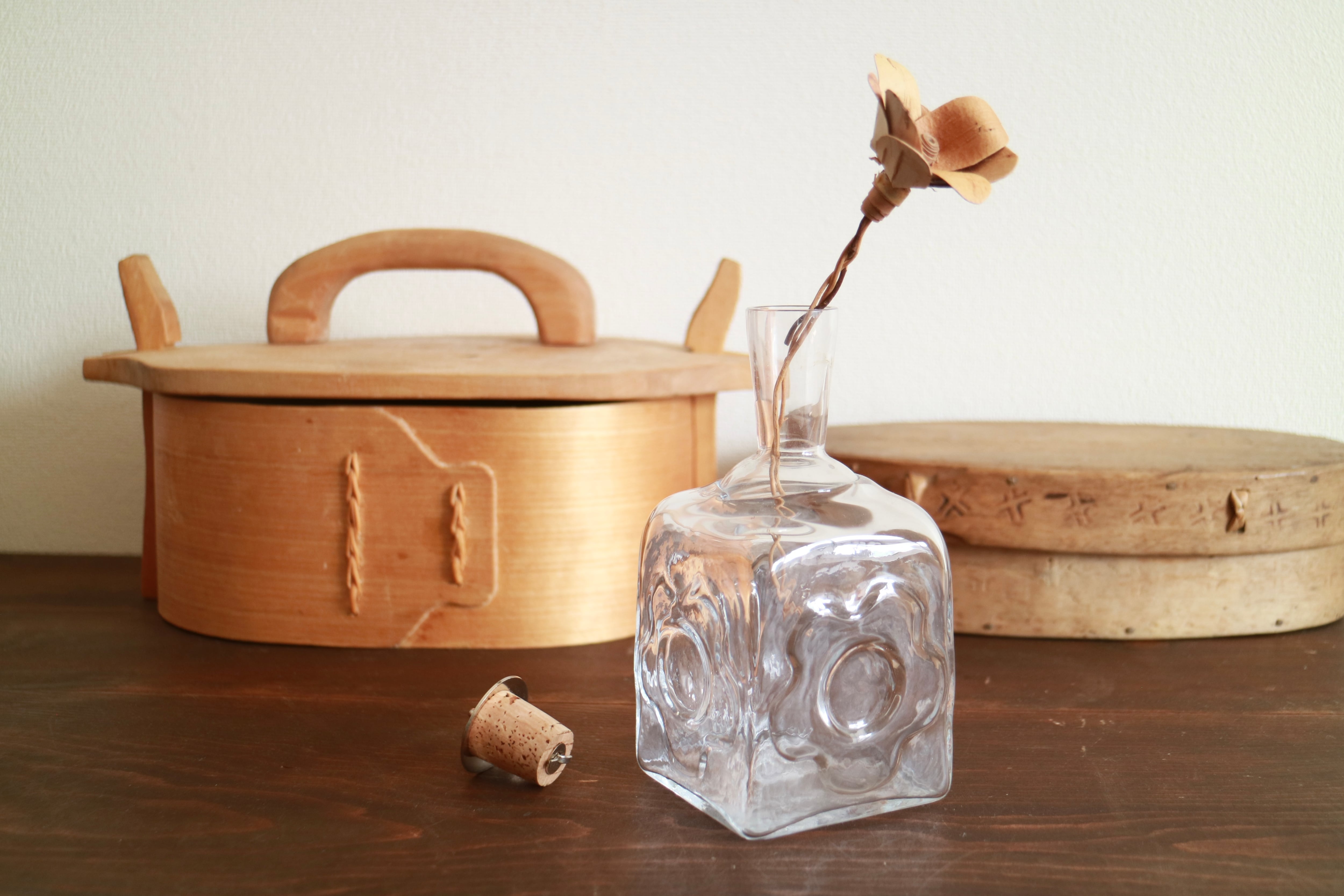 こちらは1960年代に製作されていたガラスのボトルです。表面にはレトロなお花がデザインされておりとても可愛らしい印象です。