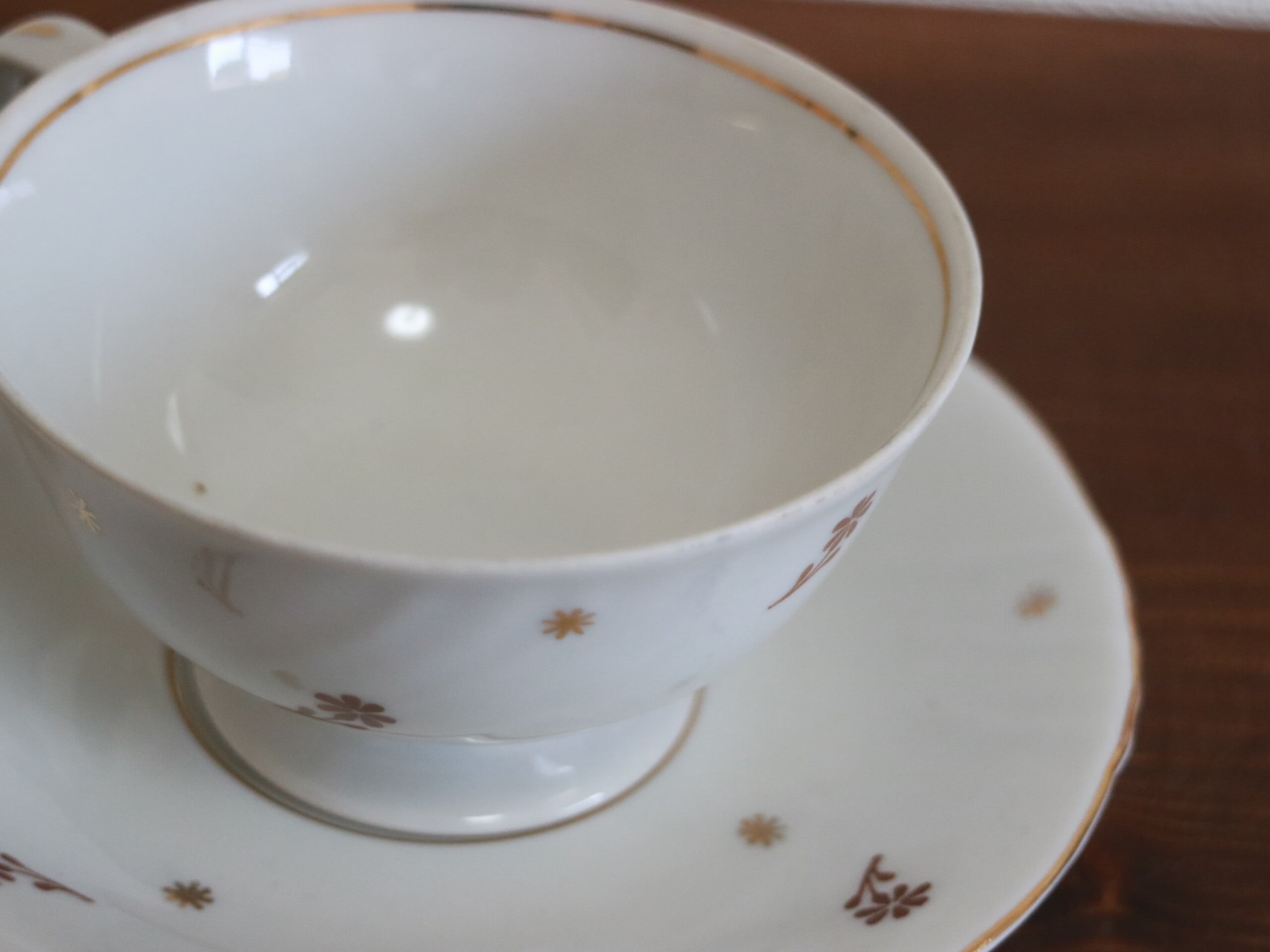 カップ縁に黒い変色、若干のザラつきございますが、ヒビや欠けなどの大きなダメージはなく、70-90年前のお品としてはとても良いヴィンテージコンディションを保っています。