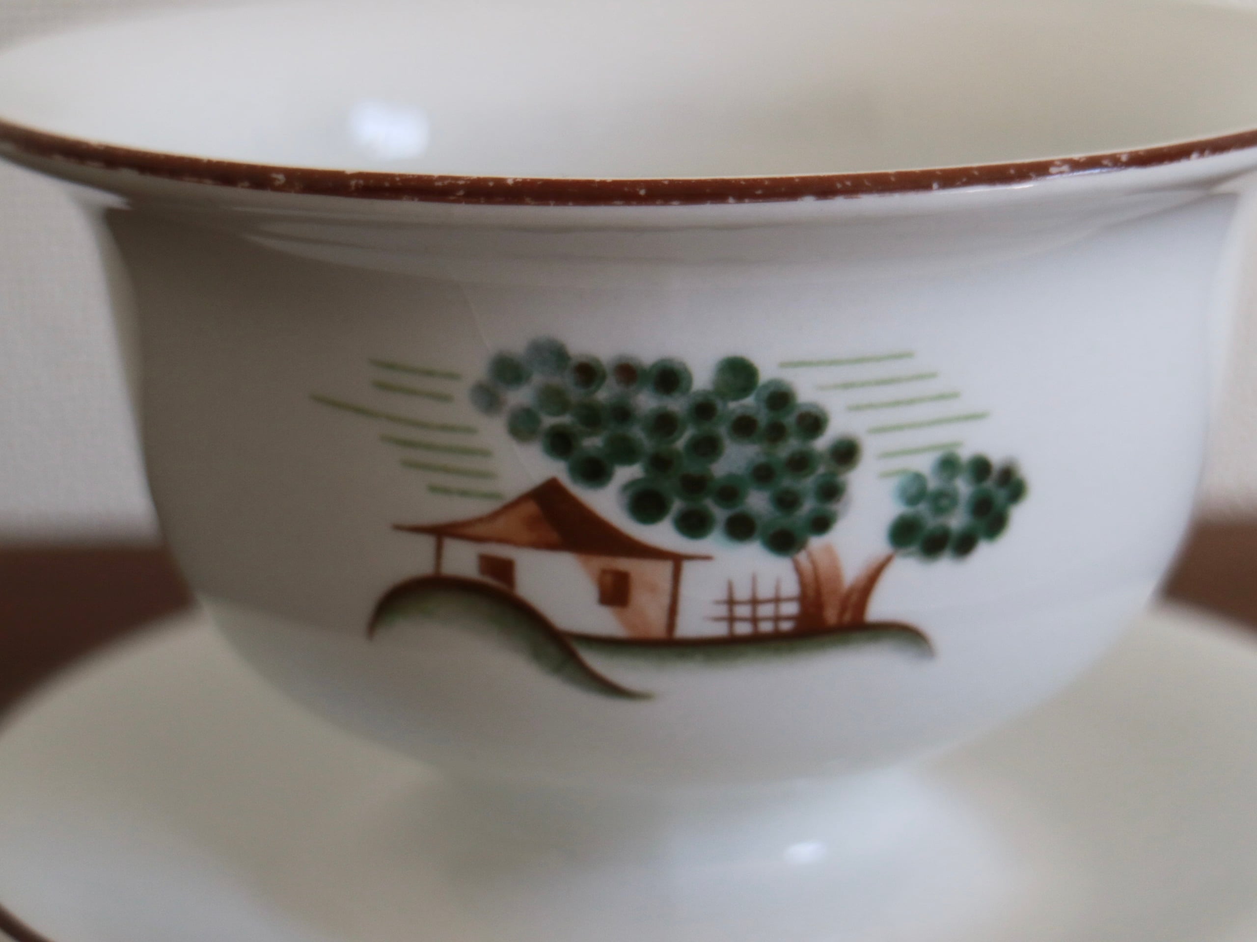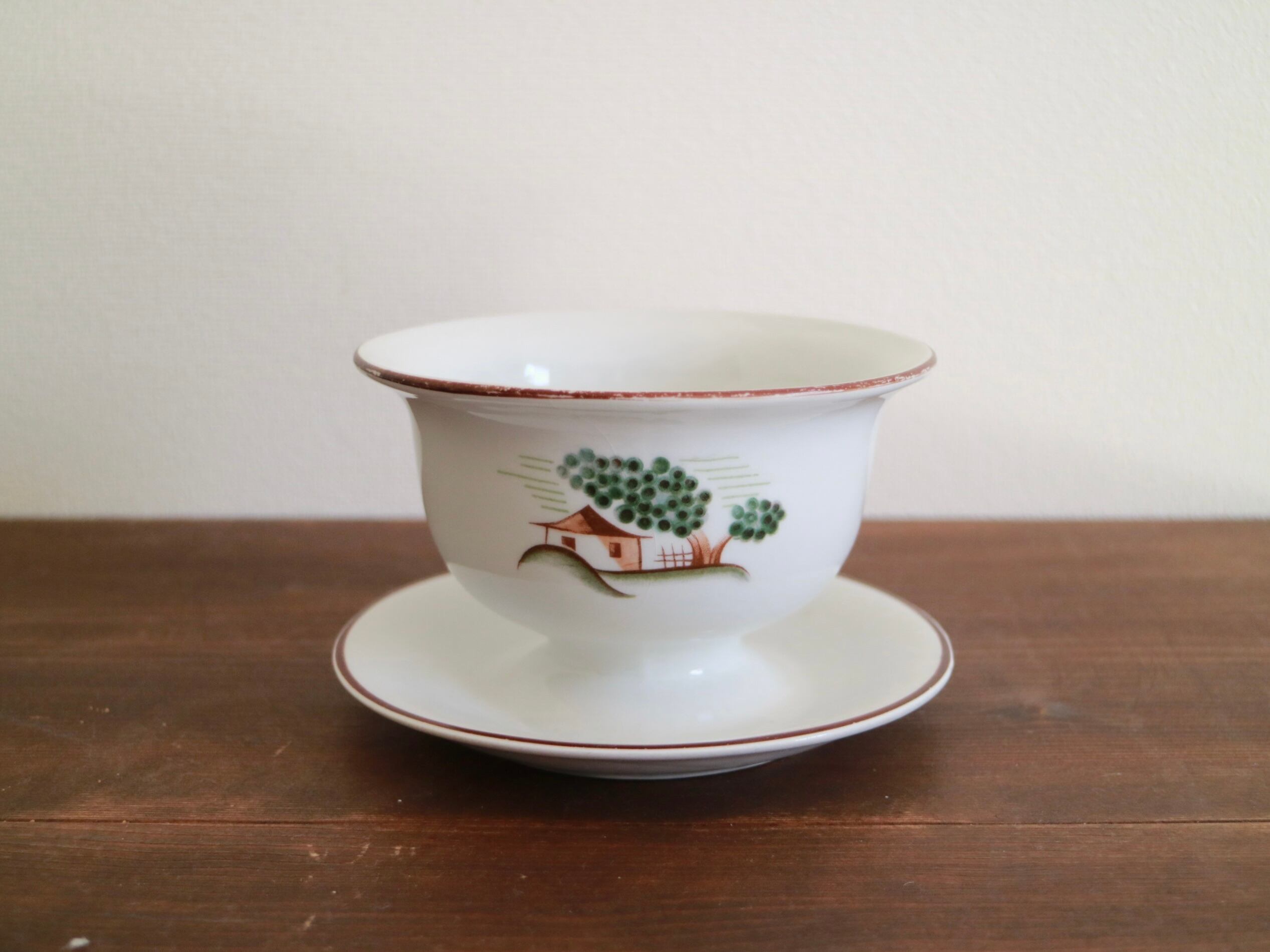 ARABIA社製 Hasiendaシリーズのプレート(22.5cm)です。プレートにはお家と大きなツリーが描かれています。絵本のワンシーンに出てきそうなレトロで可愛らしい雰囲気を感じます。こちらはバックスタンプより1932年-1949年に製造されていたOLD ARABIAと呼ばれる古いヴィンテージのお品です。
