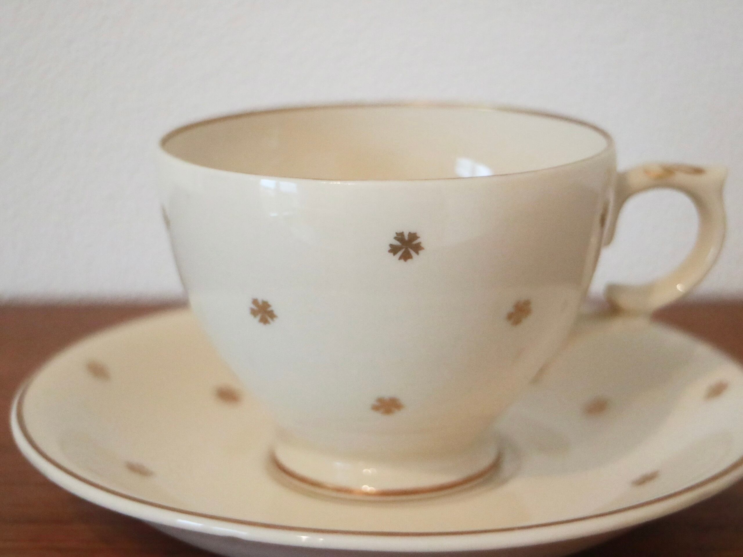 ARABIA社製、SIRIUSシリーズのカップ&ソーサーです。モデルはTIモデル。ベースは優しいクリームベージュカラー、その上には金彩で「夜空に輝くシリウス」が描かれています。シリウスとは地球上から見える全ての宙(=全天(ぜんてん))で輝く星の中で一番明るい星です。
