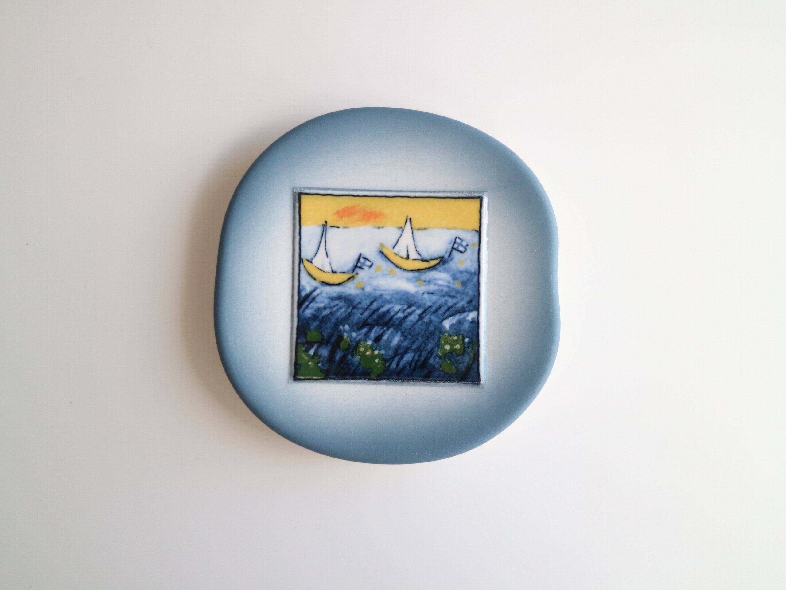 陶板に描かれているのは、フィンランドの国旗を掲げたヨットが2隻、仲良く並んで渡航しています。
