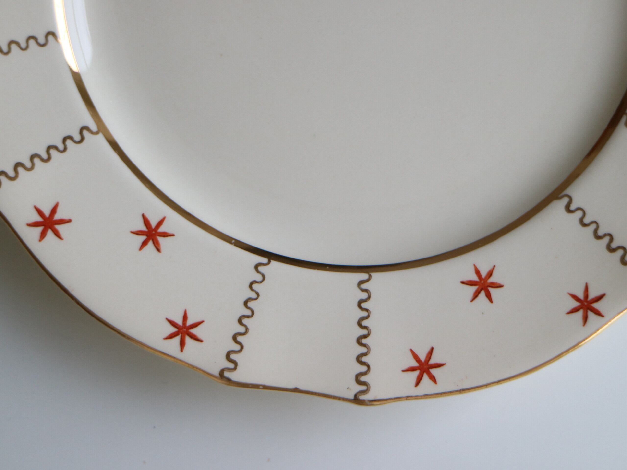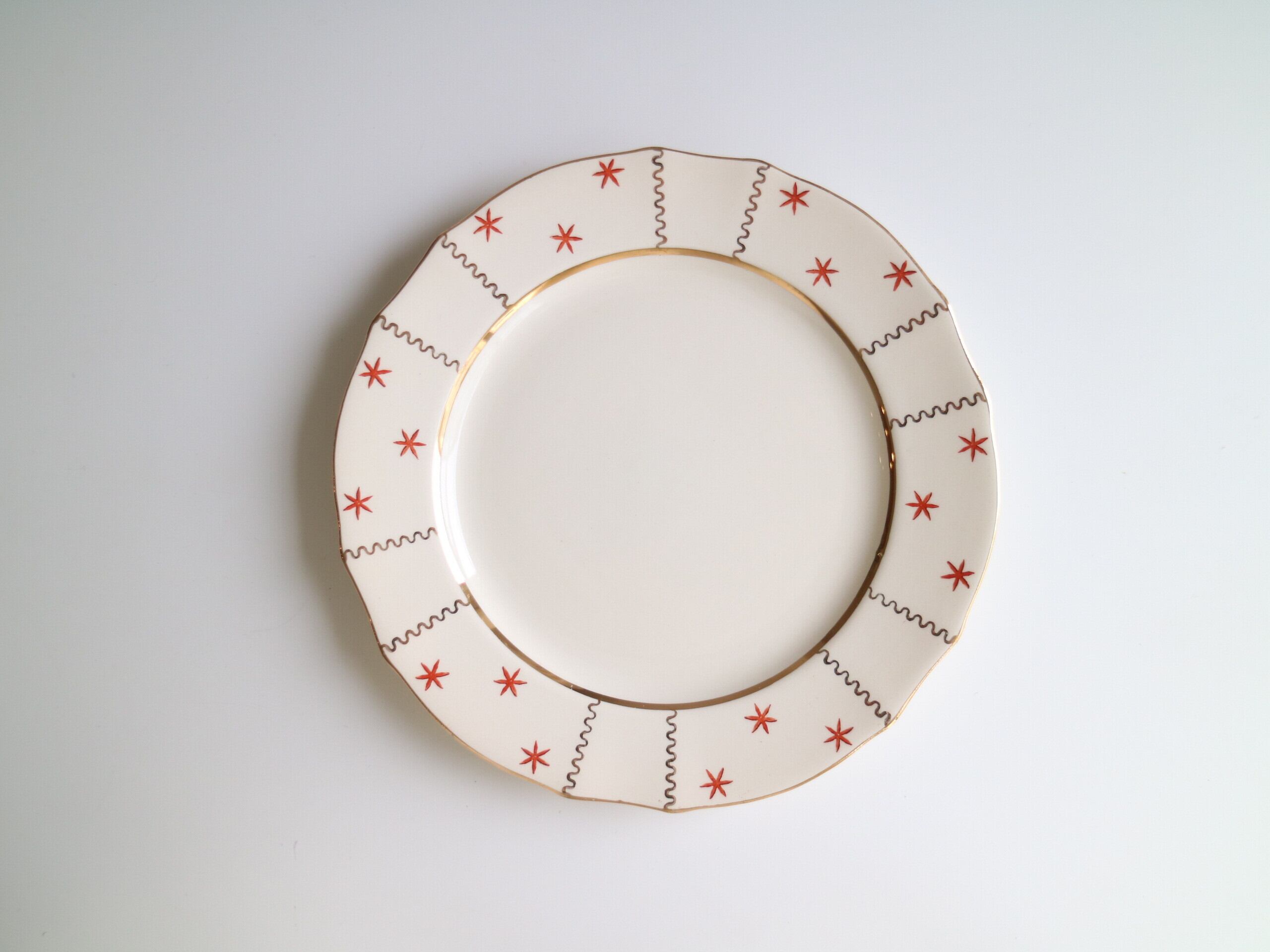ARABIA社、Viktoria(ヴィクトリア)シリーズのプレート(17.0cm)です。1932年 - 1949年に製造されていたOLDARABIAと呼ばれる古いヴィンテージのお品です。オレンジで雪の結晶をモチーフにしたようなデザインと、うねうねの金彩ラインがレトロでとても可愛いプレートです。