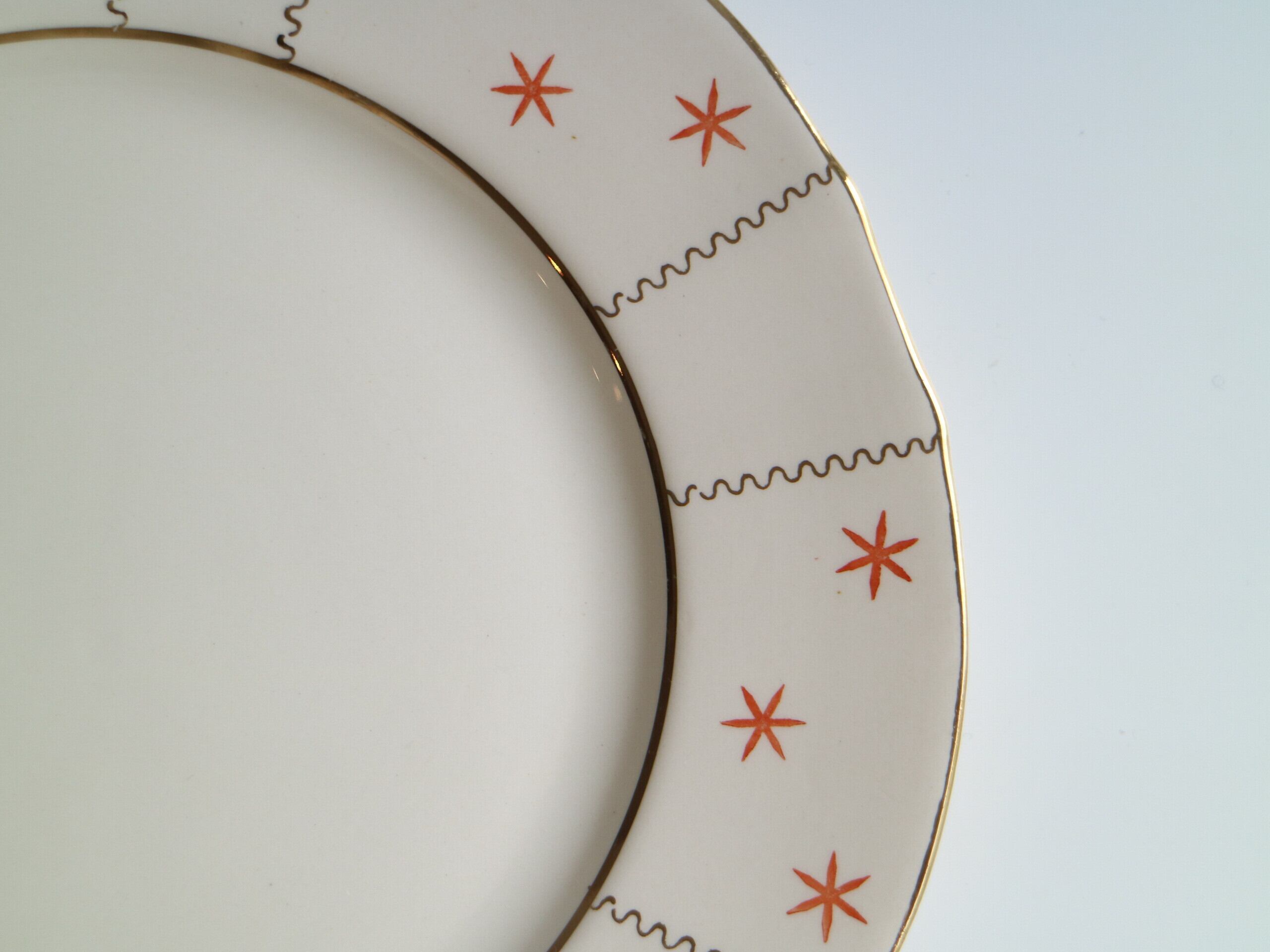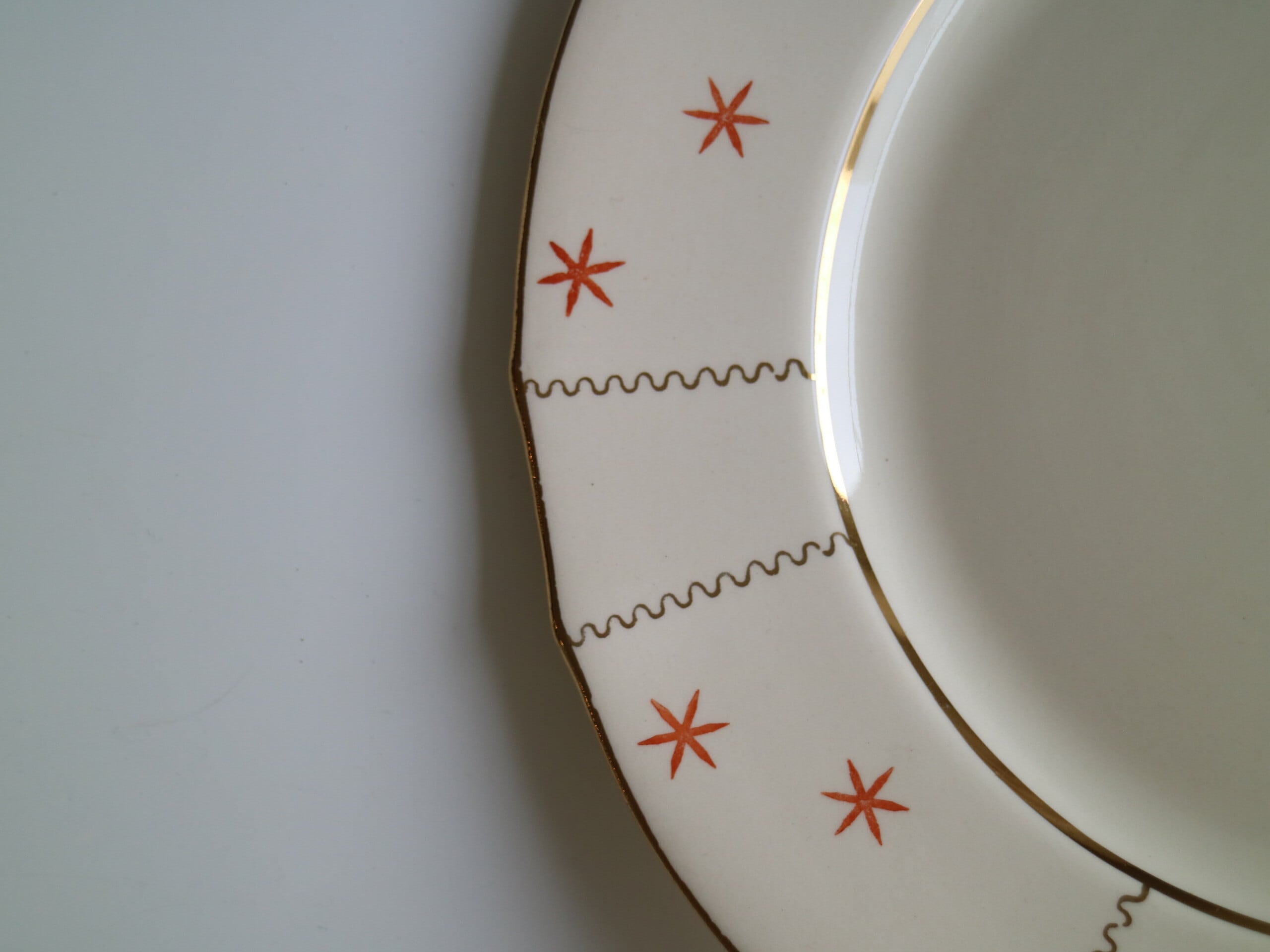 ARABIA社、Viktoria(ヴィクトリア)シリーズのプレート(23.0cm)です。1932年 - 1949年に製造されていたOLDARABIAと呼ばれる古いヴィンテージのお品です。オレンジで雪の結晶をモチーフにしたようなデザインと、うねうねの金彩ラインがレトロでとても可愛いプレートです。