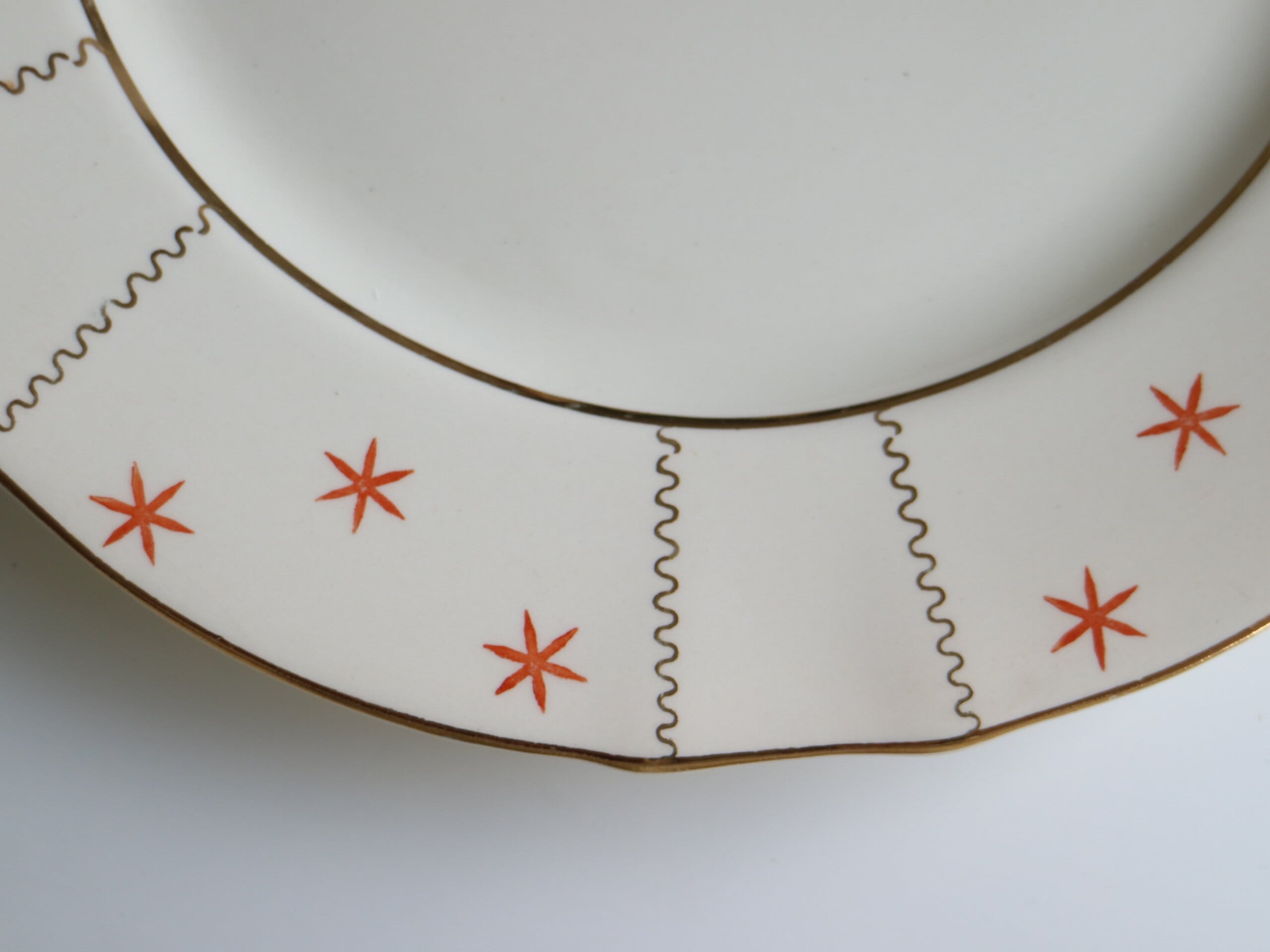 ARABIA社、Viktoria(ヴィクトリア)シリーズのプレート(23.0cm)です。1932年 - 1949年に製造されていたOLDARABIAと呼ばれる古いヴィンテージのお品です。オレンジで雪の結晶をモチーフにしたようなデザインと、うねうねの金彩ラインがレトロでとても可愛いプレートです。