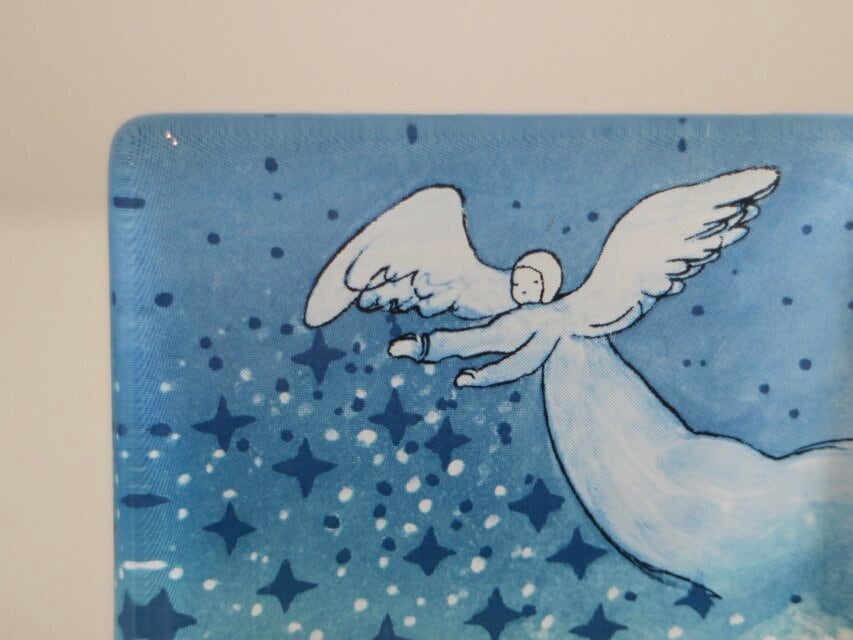 ガラスにはたくさんの星が描かれており、今にも星が(雨のように)降り出しそうな夜空と可愛らしい天使が描かれています。