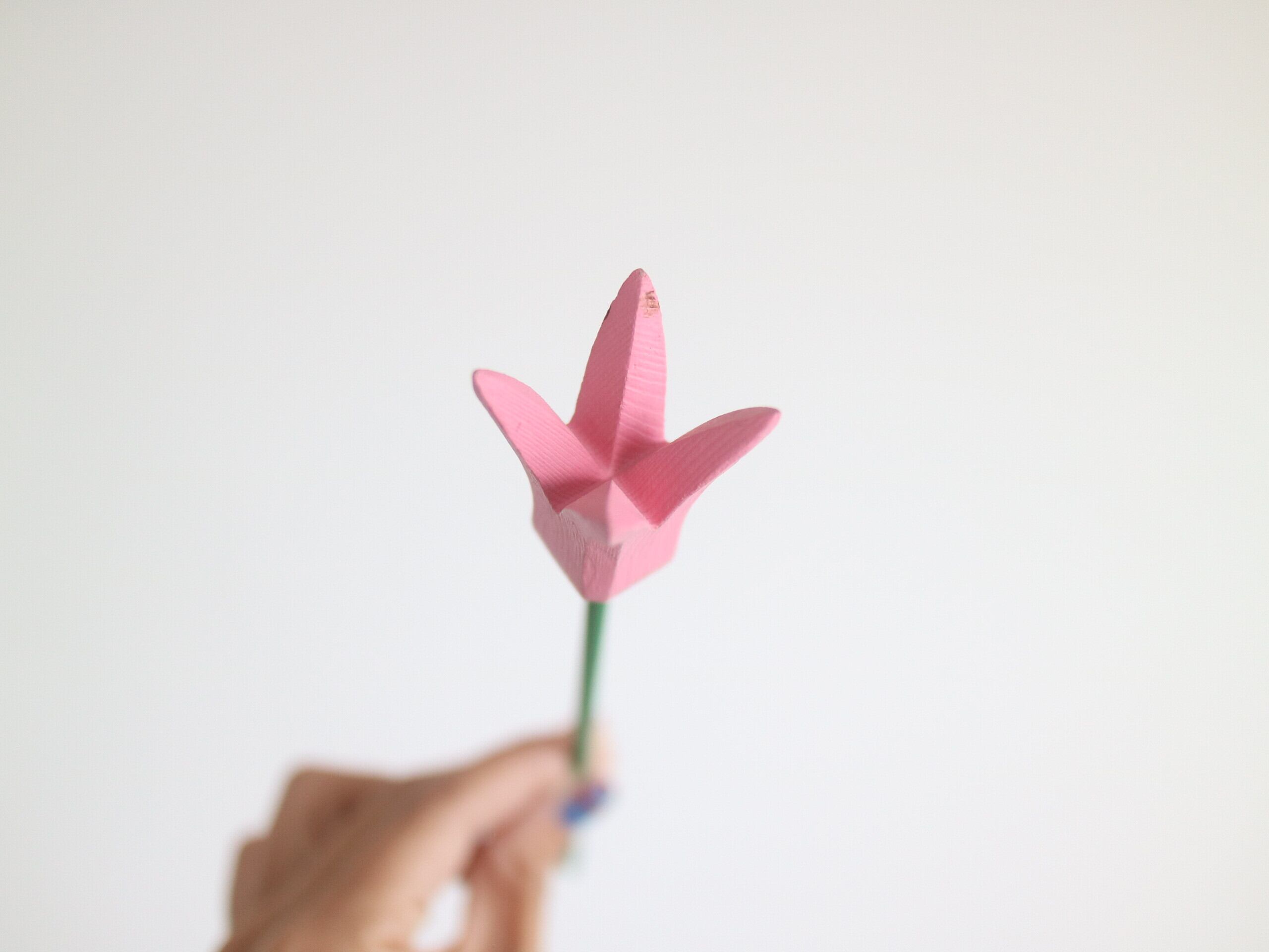 スウェーデンで見つけた木製のチューリップと葉っぱのオブジェです。