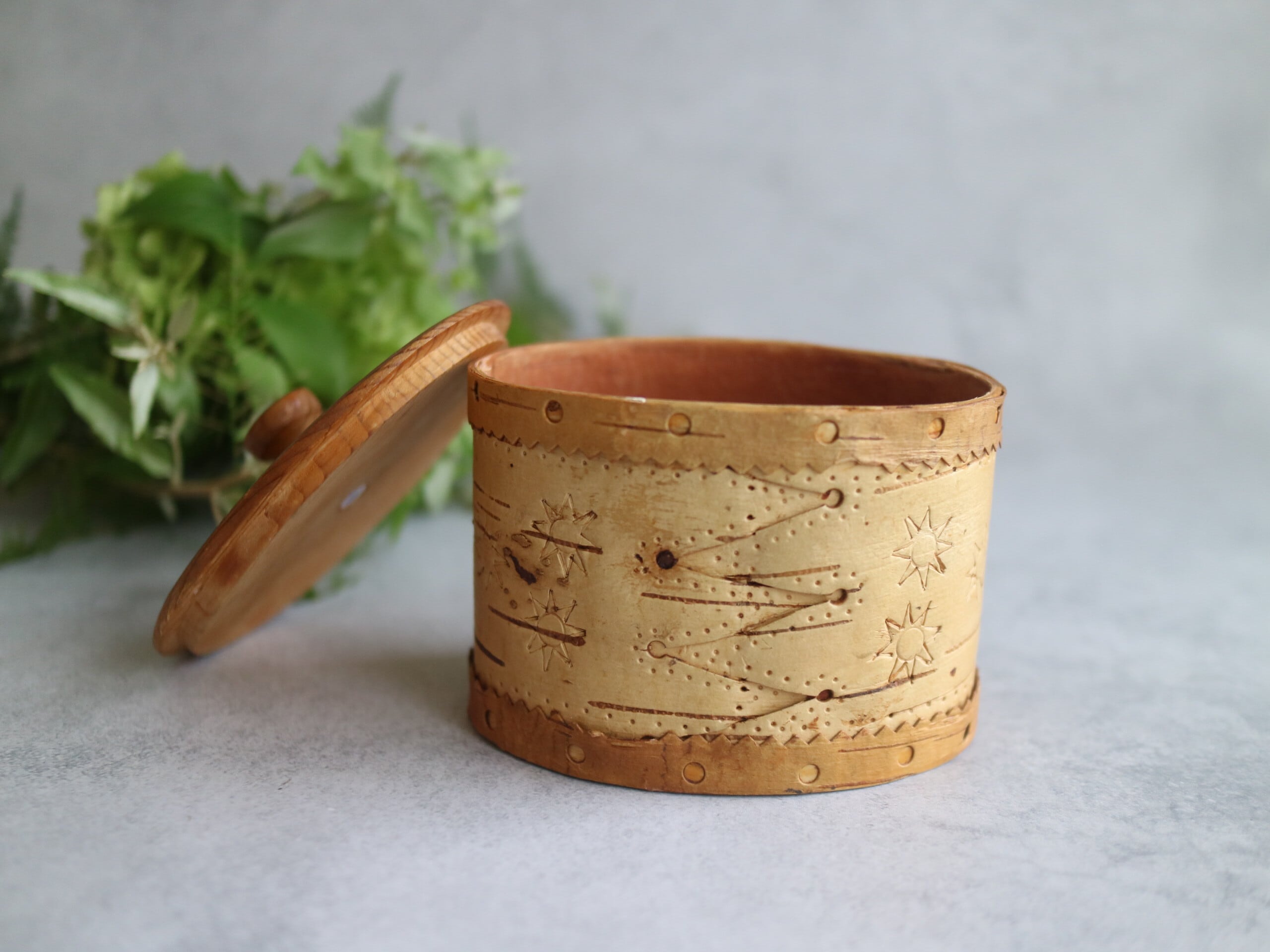 昔から北欧の国々では、白樺樹皮を使って暮らしに関わる様々なアイテムが作られてきました。こちらのキャニスターもその1つだと思います。小物を入れたり、お菓子を入れたり様々な用途でお使いください。白樺の樹皮には防水性や抗菌・防腐の役割もあると言われていているのも嬉しいポイントです。ハンドメイドならではの温かい雰囲気をお楽しみください。