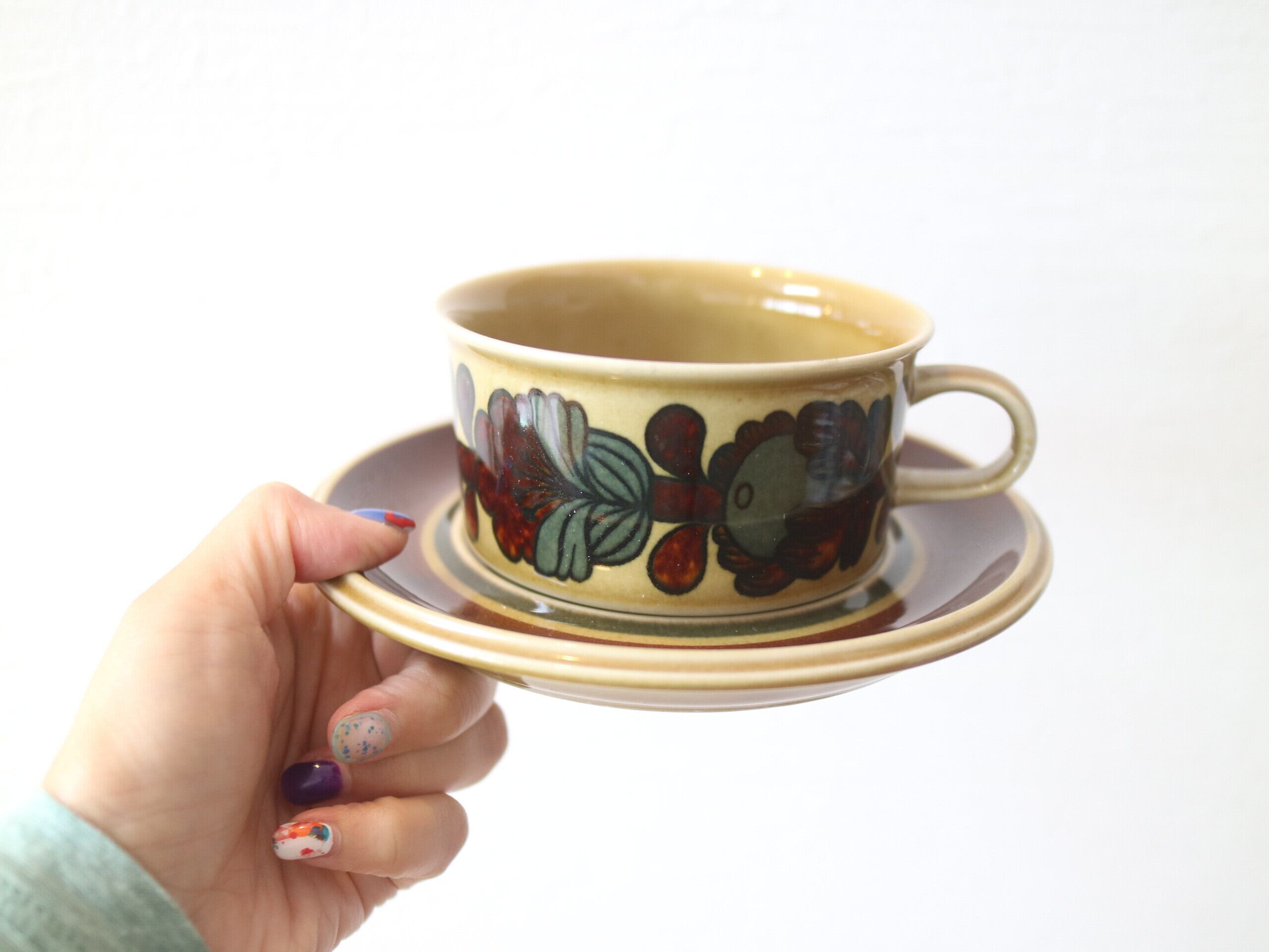 ARABIA社 Otsoシリーズのティーカップ&ソーサーです。Otsoはフィンランド語で「クマ」を意味します。Raija Uosikkinenによってデザインされ、カップ表面にはクマが大好きな どんぐりの実と花が大胆に装飾されています。ベースの淡い釉薬の色調と どんぐりの実と花の深い色調のコントラストがなんともレトロな雰囲気を感じる作品です。