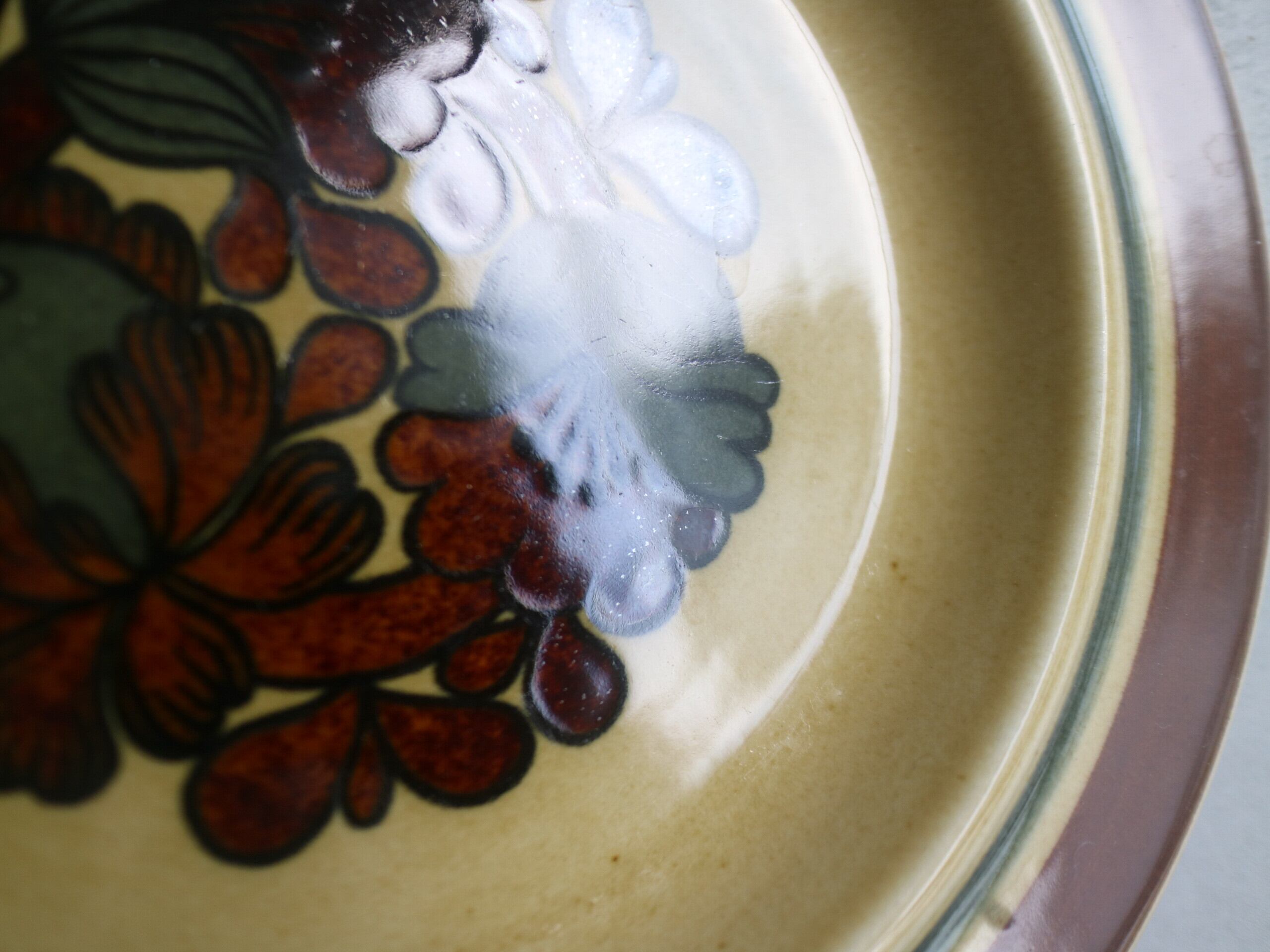 ARABIA社 Otsoシリーズのプレートです。Otsoはフィンランド語で「クマ」を意味します。Raija Uosikkinenによってデザインされ、プレート表面にはクマが大好きな どんぐりの実と花が大胆に装飾されています。ベースの淡い釉薬の色調と どんぐりの実と花の深い色調のコントラストがなんともレトロな雰囲気を感じる作品です。