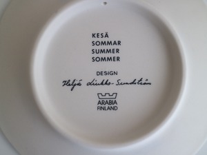 こちらの陶板は1980年代頃の四季を描いたシリーズで、タイトルは「KESÄ」。フィンランド語で夏を意味します。プレートにはフィンランドの夏の湖の風景や白樺の木々、そして太陽が描かれています。