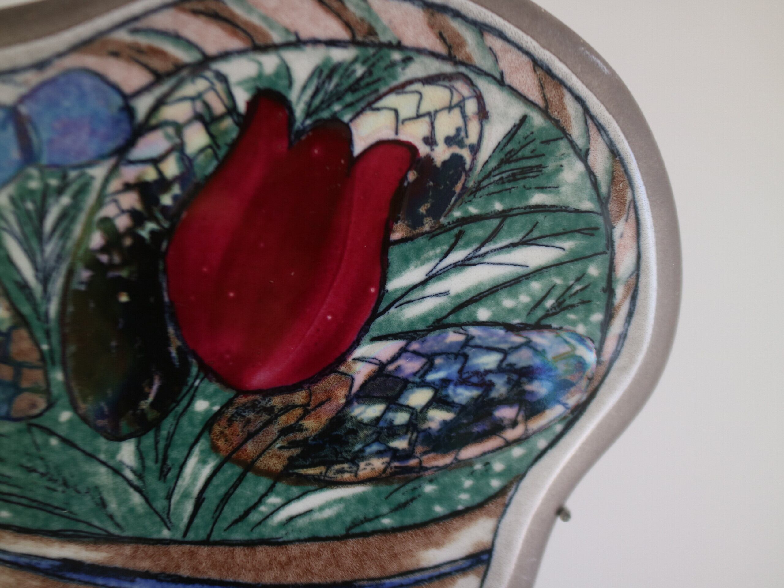 こちらは「Bascet of Tulips」というタイトルのウォールプレートで、陶板にはバスケットに赤いチューリップと蕾のヒヤシンスが鮮やかに描かれています。