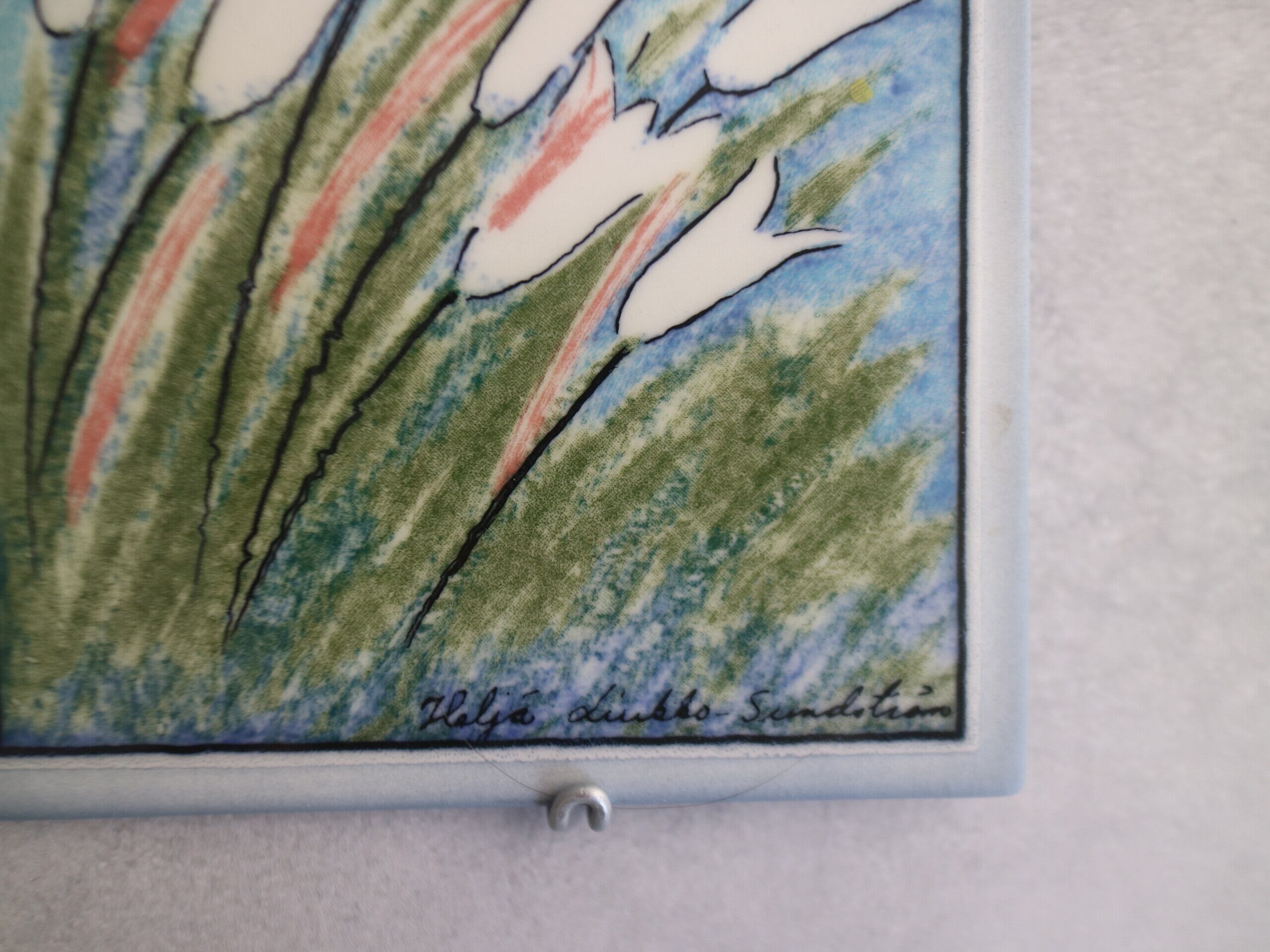陶板には白いカラーのようなユリ科のお花とデイジーのようなお花が描かれています。