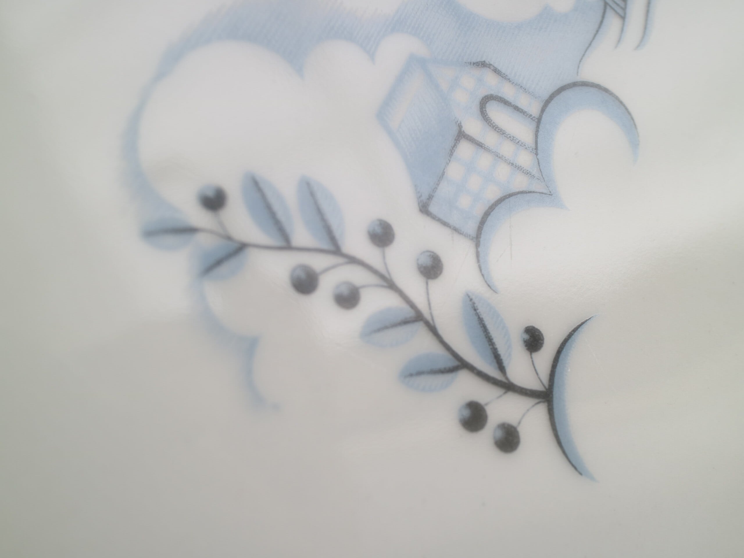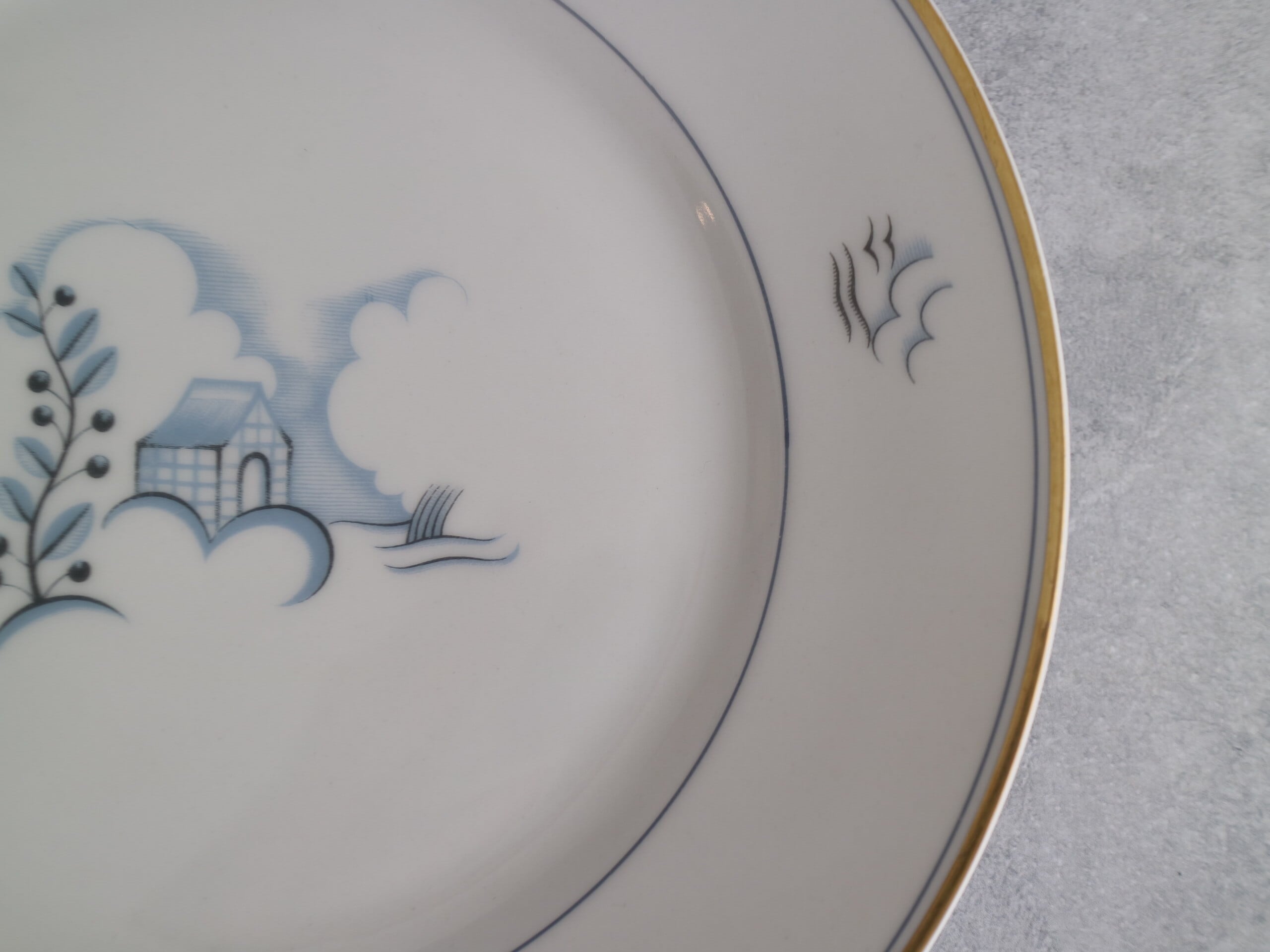 ARABIA社製 MOKKIシリーズのディナープレートです。フィンランド語のMOKKIは「コテージ」を意味します。プレートには落ち着いたグレーカラーでコテージや雲、カモメがデコレートされています。プレートのフチにはぐるりと金彩のラインが入っていますが、気取らず素朴で可愛らしさを感じるプレートです。