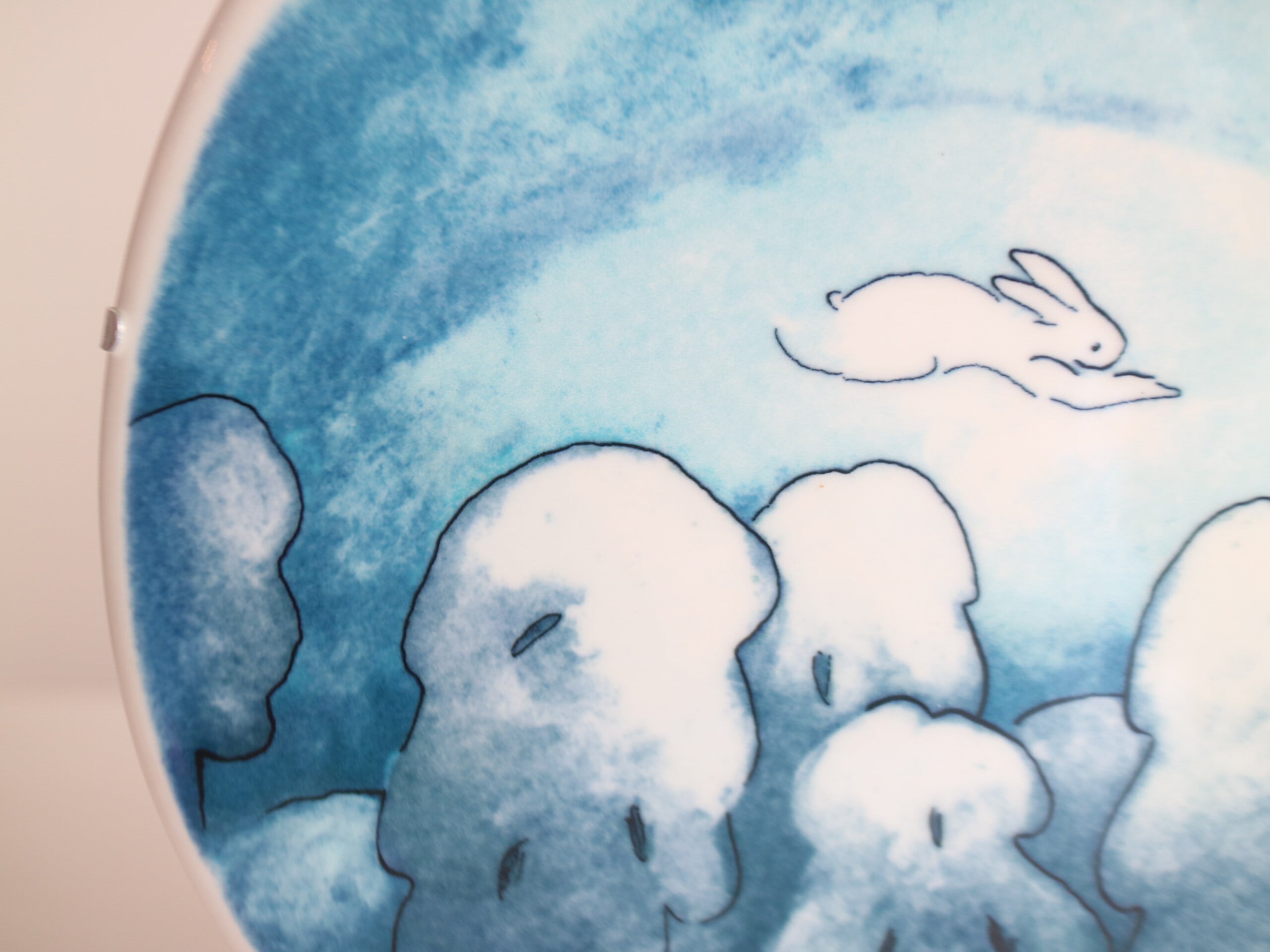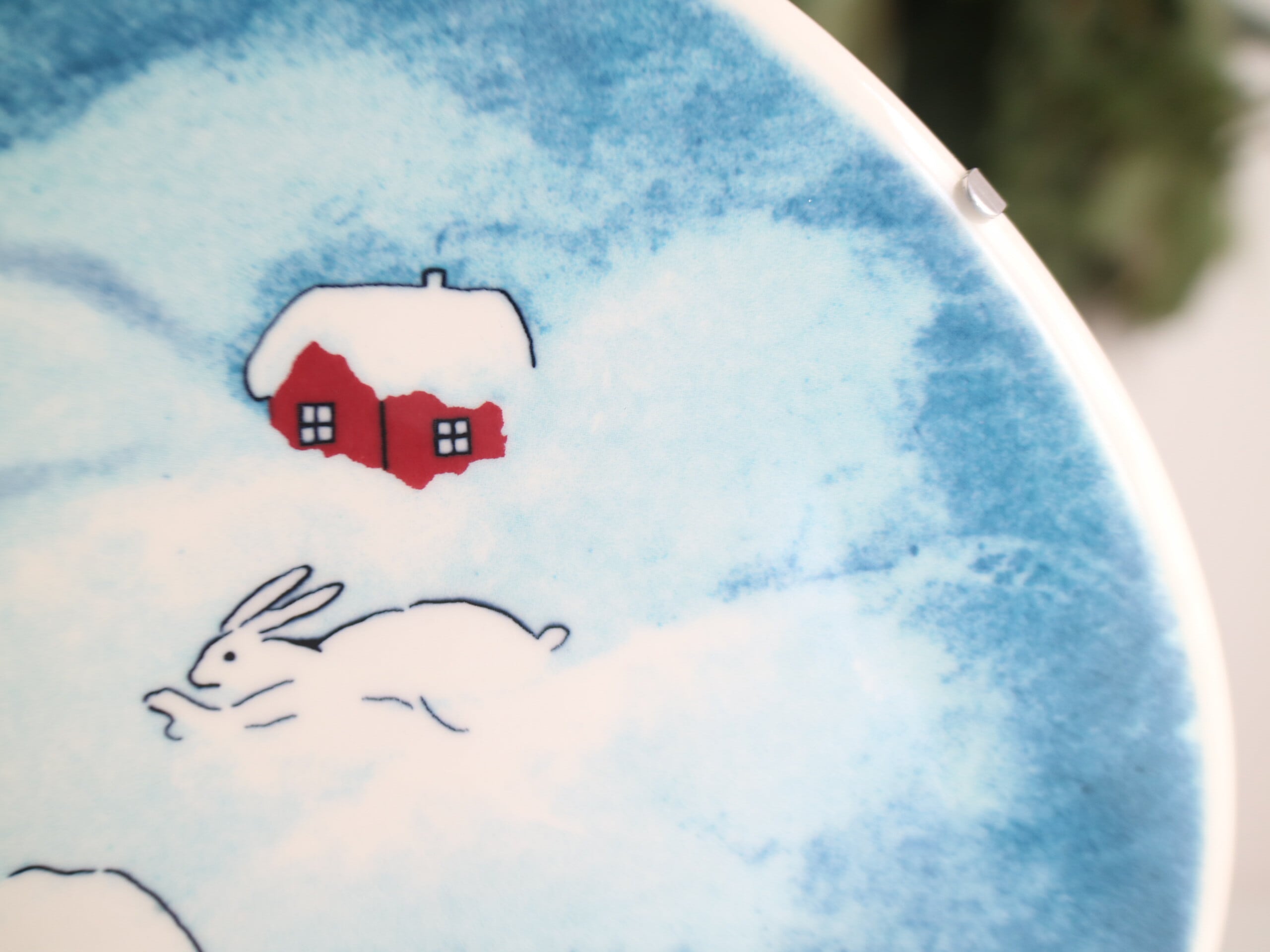 陶板には雪山で遊ぶ2匹のうさぎさんと、雪で覆われた木々や赤いお家などが描かれており、平和で微笑ましい光景です。