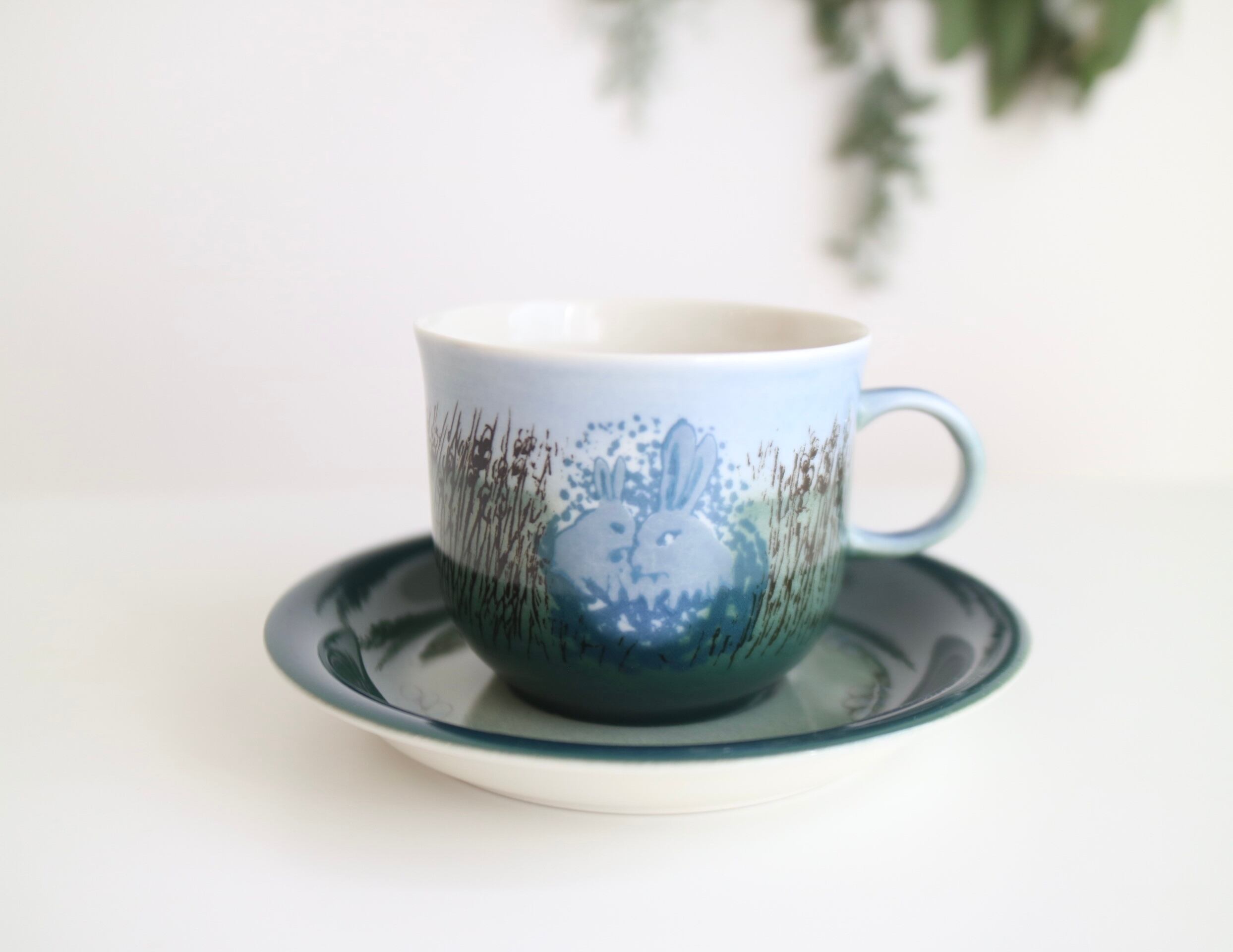 Aidilleシリーズは1977年から1982年まで毎年ちがう絵柄で6パターン製造されており、今回ご紹介のカップは1981年に作られた作品です。カップ正面にはうさぎの親子、そしてぐるりと一周麦畑が描かれています。ブルーグリーンの落ち着いたカラーで優しい雰囲気を感じます。