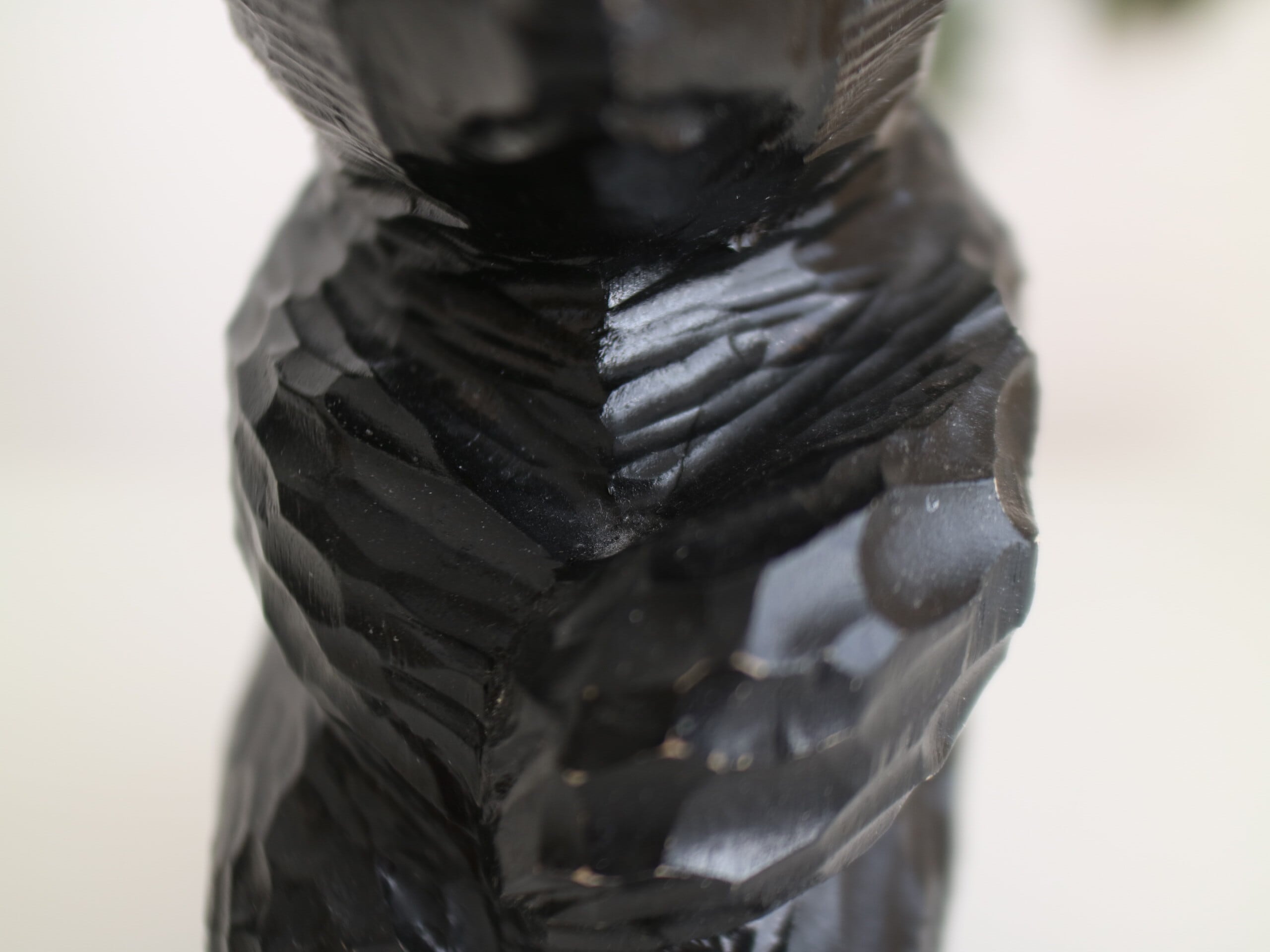 手を前に組んで座っているのでしょうか。丸っこいフォルムと黒でペイントされている感じがとても良い雰囲気です^^