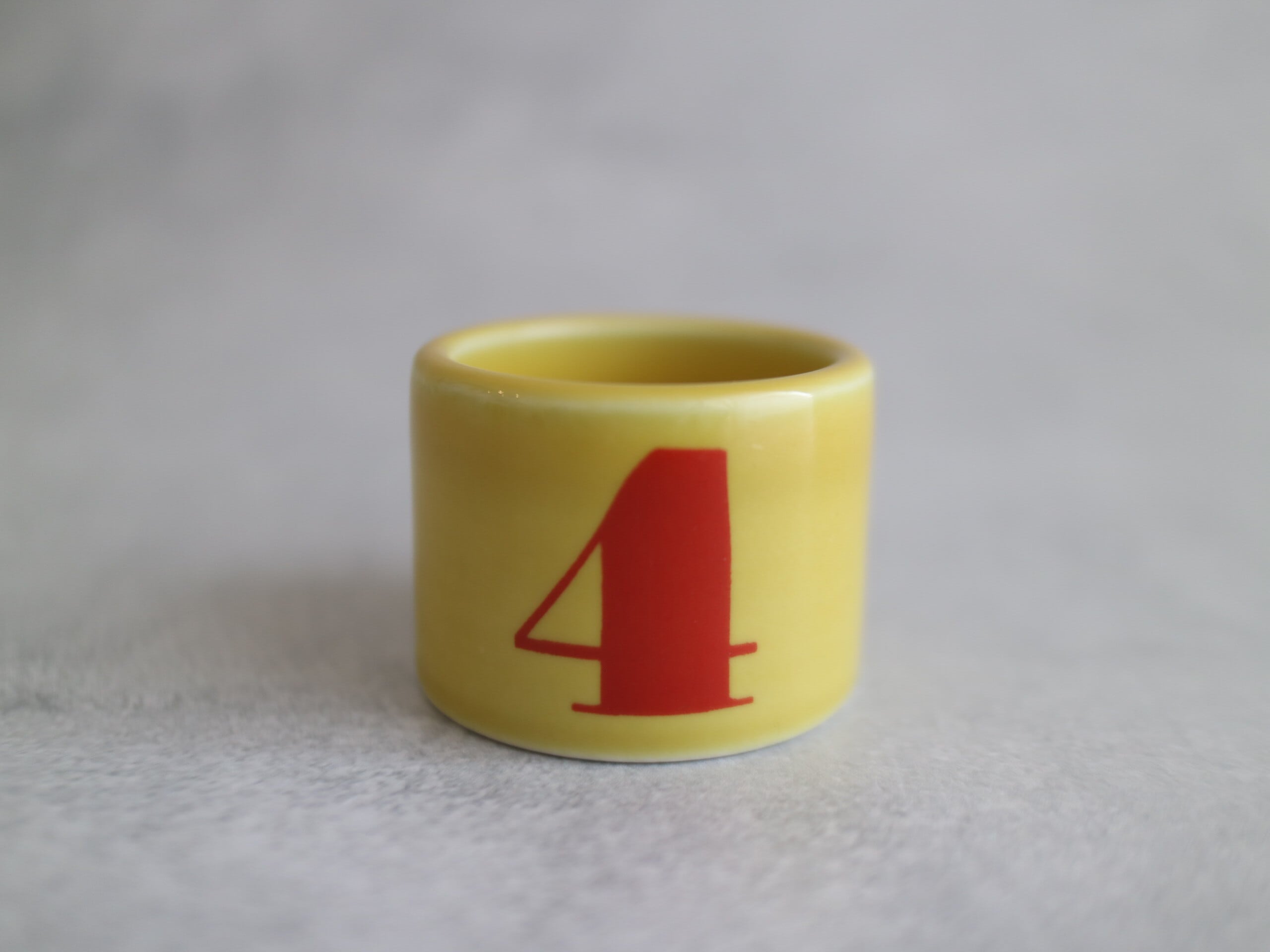 ARABIA社製 イエローカラーのナプキンリングが入荷しました。前後に数字の「4」がプリントされています。今では製造されていないようなイエローの釉薬をベースに数字のレッドカラーが映えますね。数字のフォントもカッコ良く、オブジェとして飾って楽しんで頂くのもアリですね!
