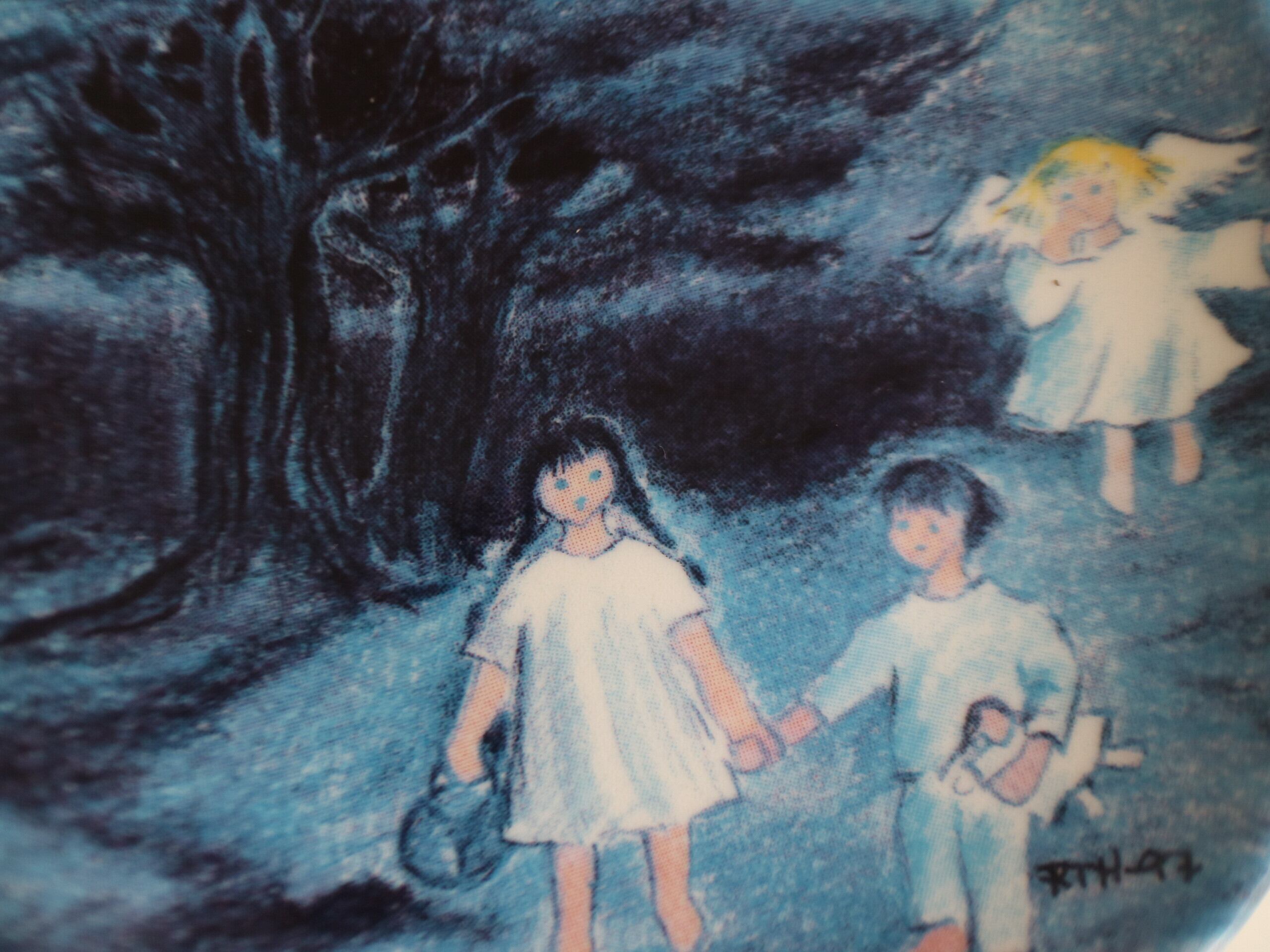 プレートには、夜の森を女の子と男の子が手を繋いで歩いており、その後ろには天使が。夜の森を探検する2人を見守っているのでしょうか。