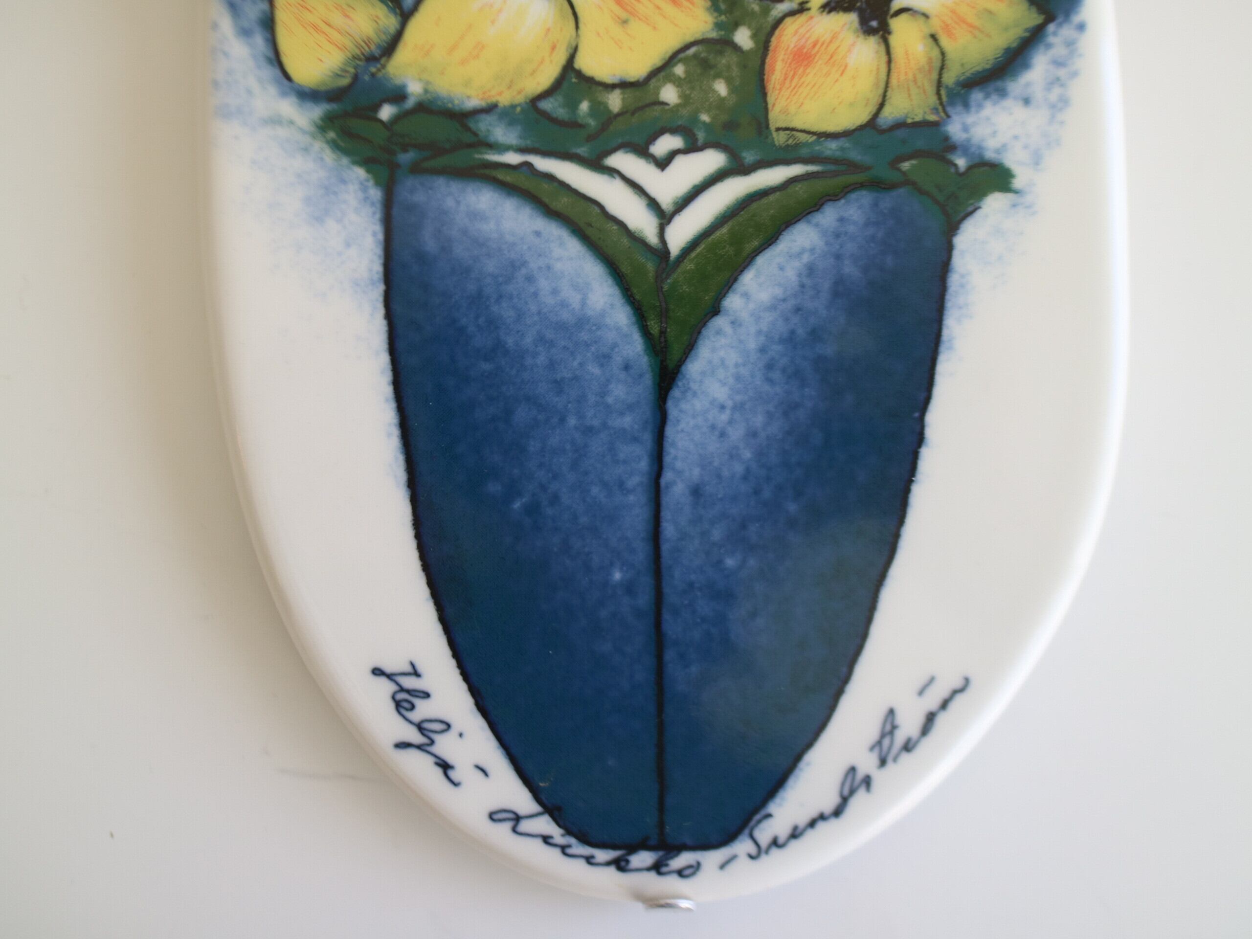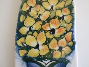 陶板にはヘルヤらしい優しいタッチで、イエローのハナミズキのような可愛らしいお花描かれており、見ているだけで元気が出てくる作品です。